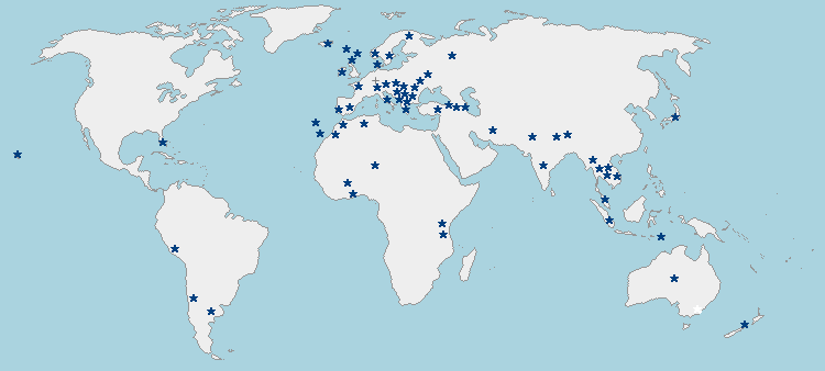 Deutschland, Österreich, Slovenien, Kroatien, Bosnien-Herzegovina, Montenegro, Albanien, Kosovo, Nordmazedonien, Griechenland, Türkei, Georgien, Armenien, Iran, Pakistan, Indien, Bhutan, Nepal, Thailand, Kambodscha, Vietnam, Laos, Myanmar, Malaysia, Indonesien, Osttimor, Australien.