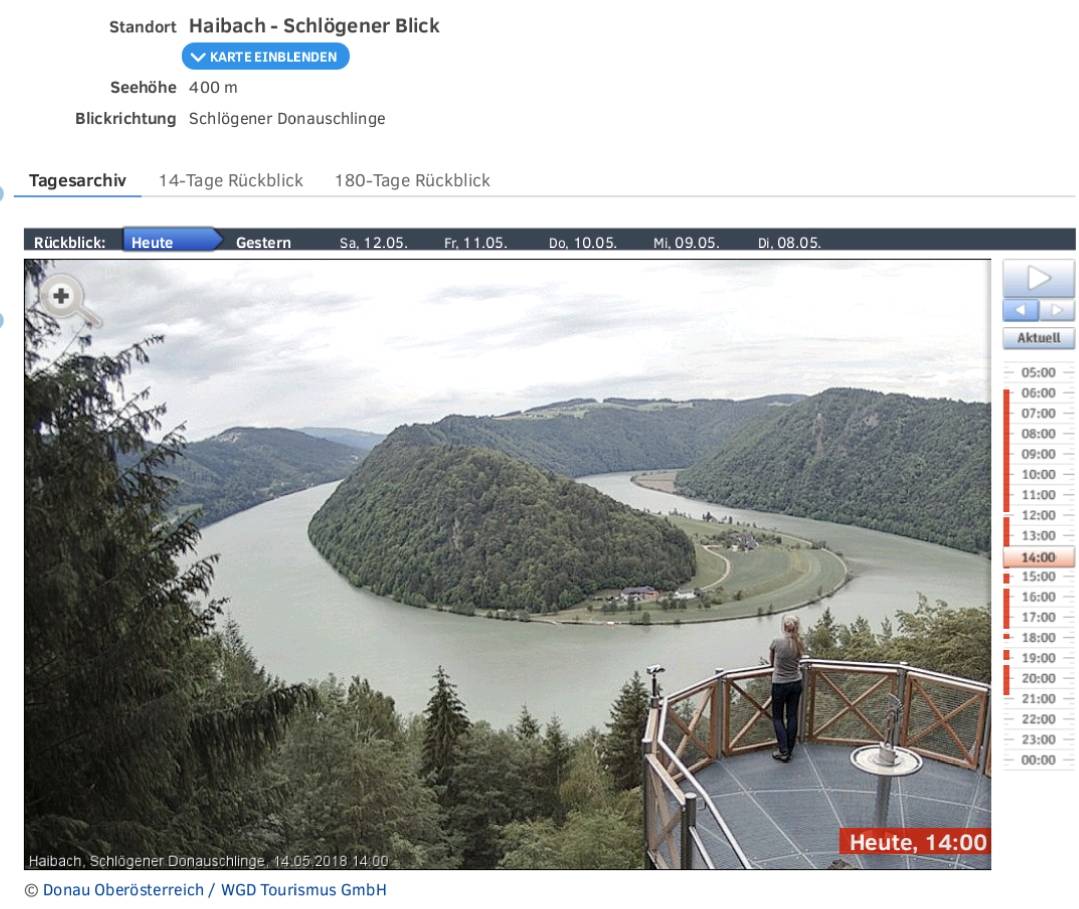 Schlögener Blick auf die gleichnamige Donauschlinge mit Ulrike, aufgenommen von der dortigen Webcam.