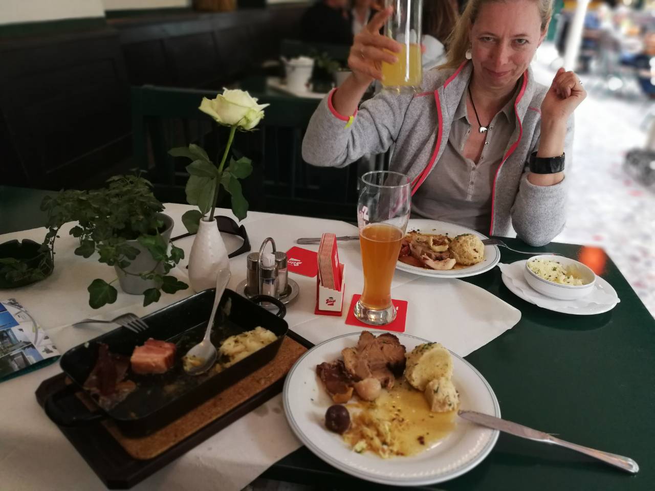 Danach deftige oberösterreichische Küche im "Klosterhof" in Linz: Surbrüstel und Schweinsschopf im Reindl serviert, mit Blunzn, Grammelknödel, Bratwurst, Semmelknödel und warmen Speckkrautsalat. Zum Trinken Radler und Russ. Wir haben alles ratzeputz aufgegessen. Der Keller sprach ein anerkennendes Lob aus!