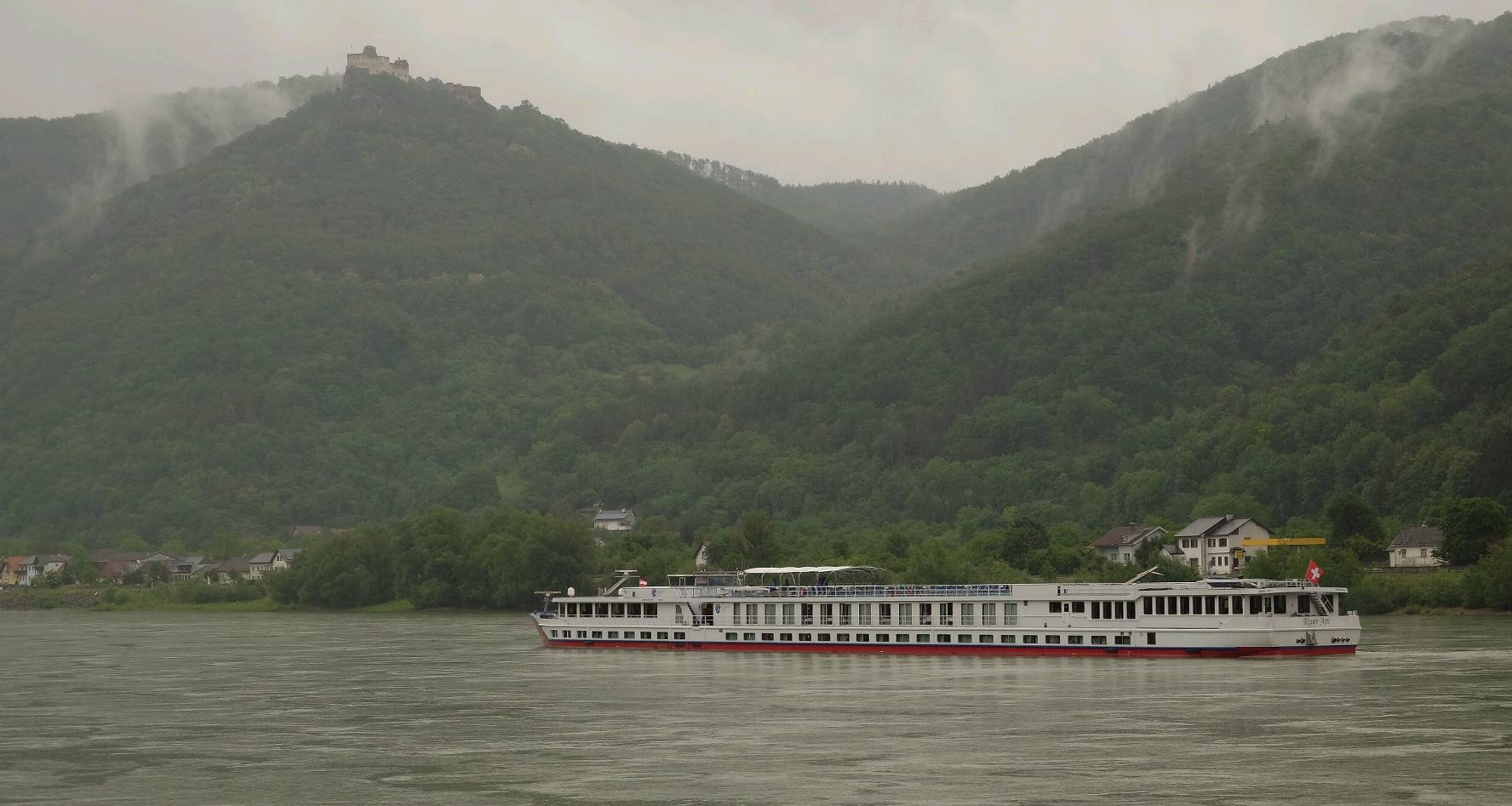 Ein Wahrzeichen der Wachau: Burgruine Aggstein hoch über der Donau mit einem der vielen Flusskreuzfahrtschiffe.