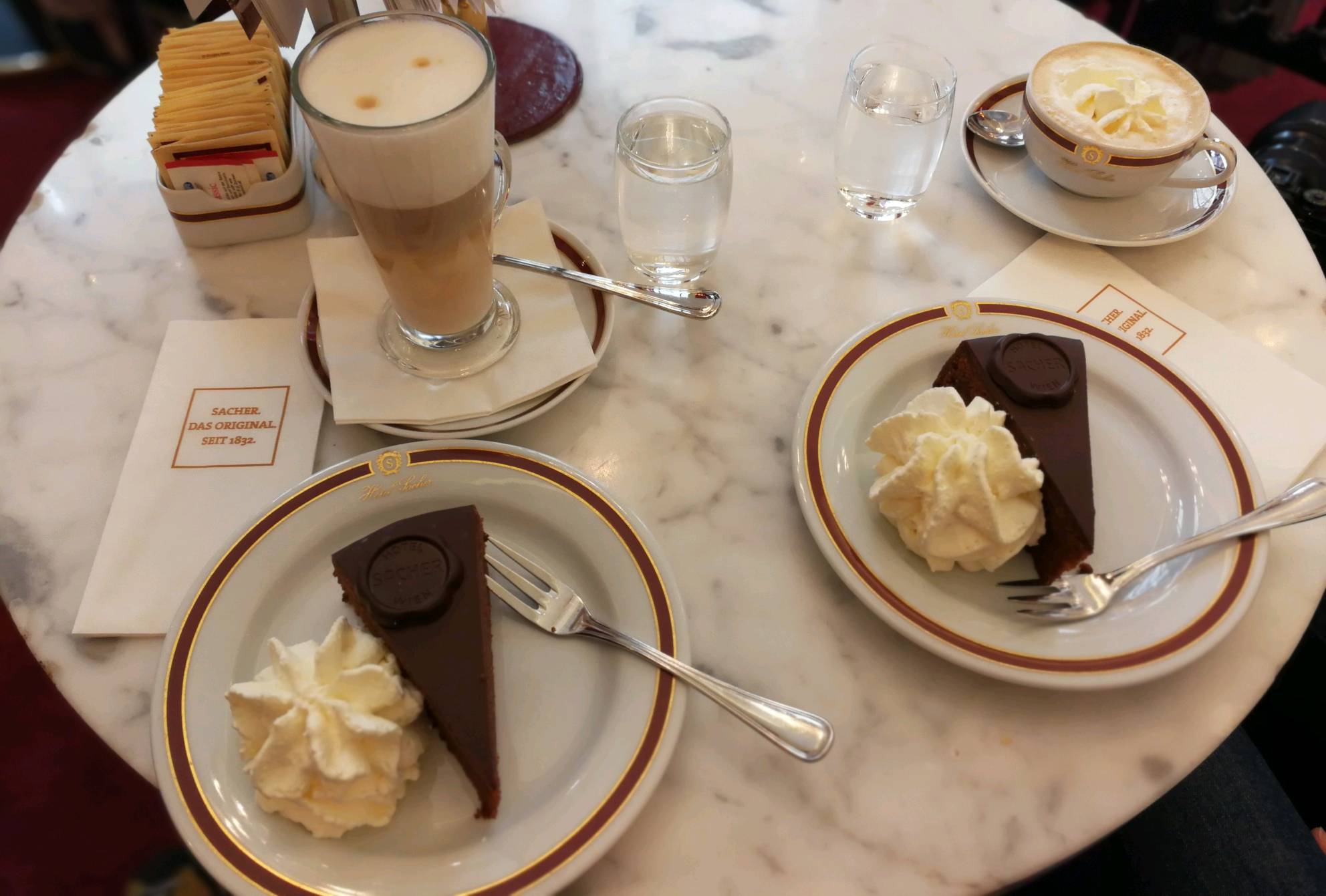 Im Café des Hotel Sacher, Kaffee und die besagte Torte. Wir mussten gar nicht lange vor dem Eingang warten, bevor wir plaziert wurden. Drinnen war's dann elegant und total entspannt.