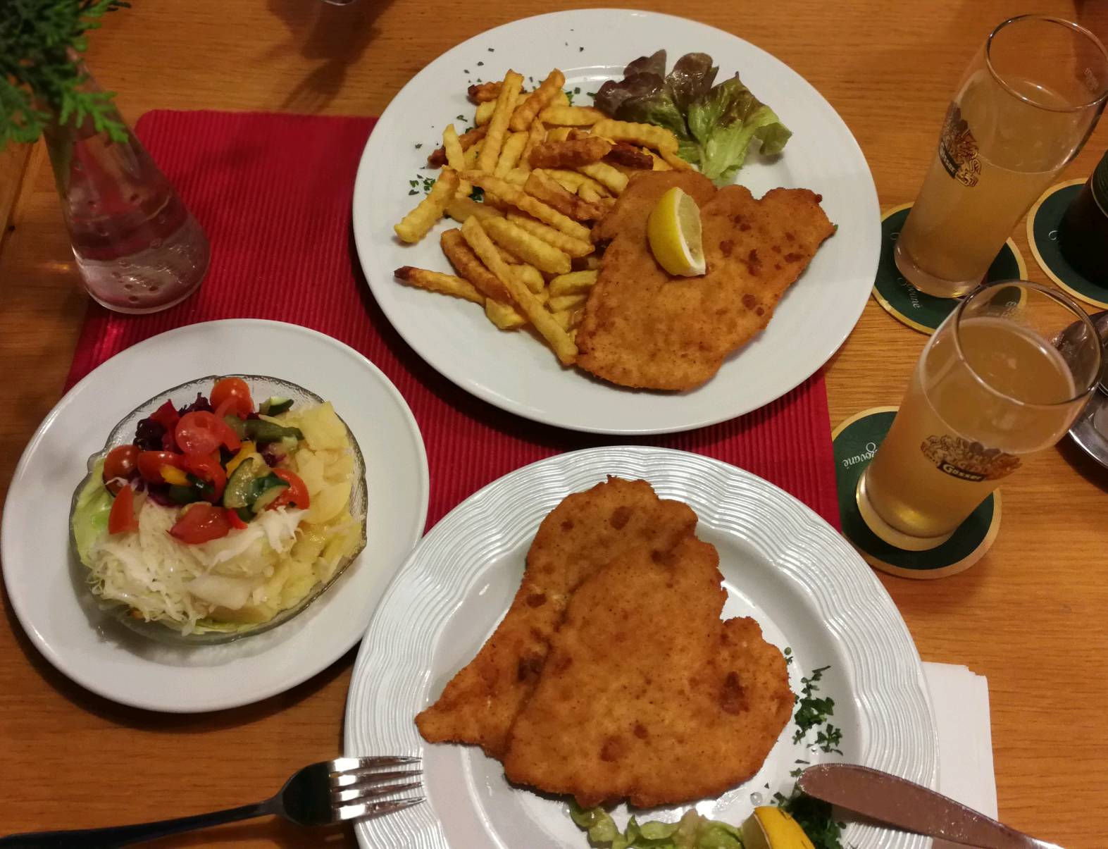 Und am Abend dann, nach fast 20 km(!) Stadtrundgang mit Belvedere, Naschmarkt, Hofburg, Volksgarten, Stephansdom u.v.m. in einem kleinen Wirtshaus das obligatorische und schwer verdiente Wiener Schnitzel.