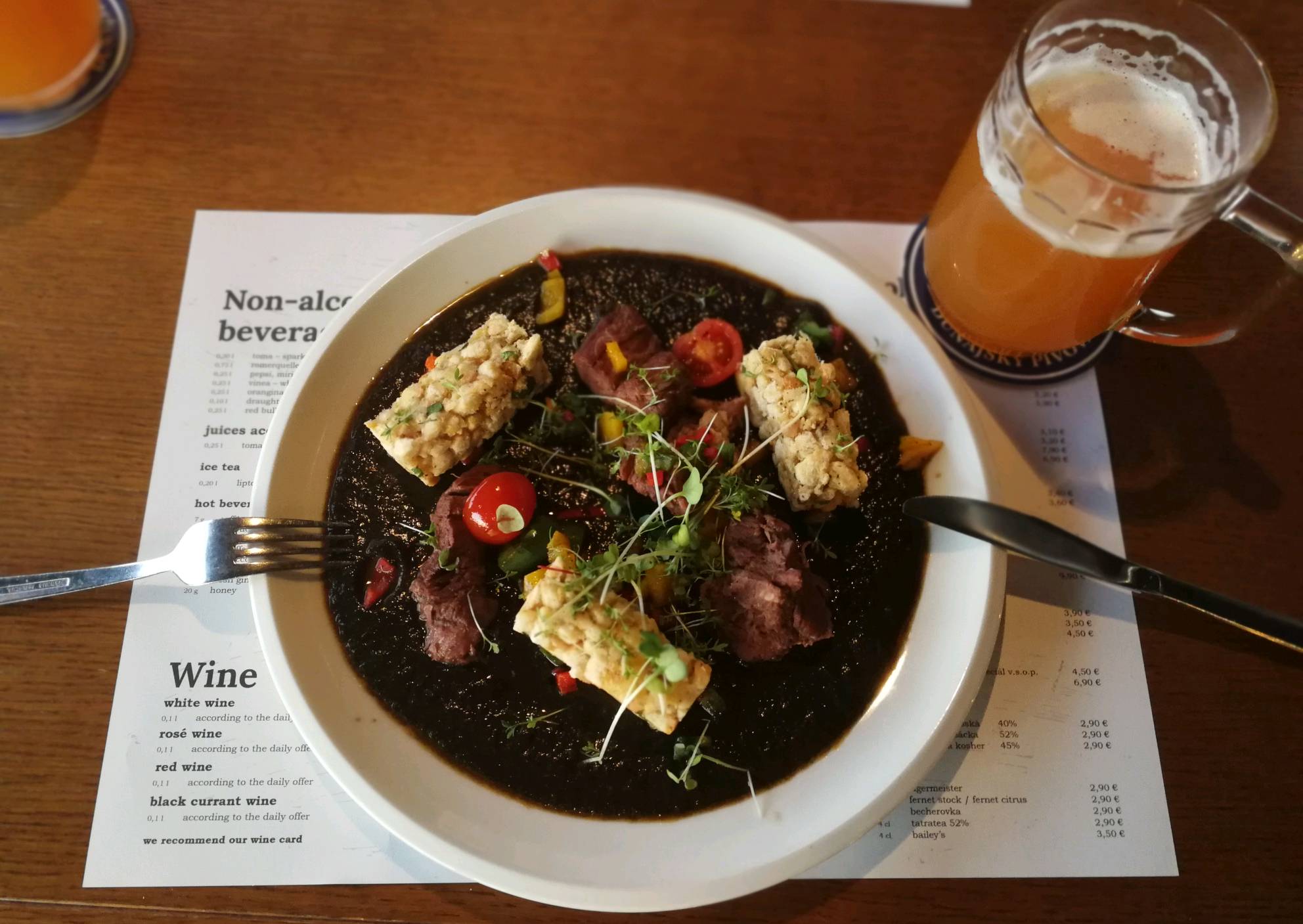 Gulasch in Dunkelbiersoße mit handgemachten Karlsbader Klößen. Dazu ungefiltertes Lagerbier...