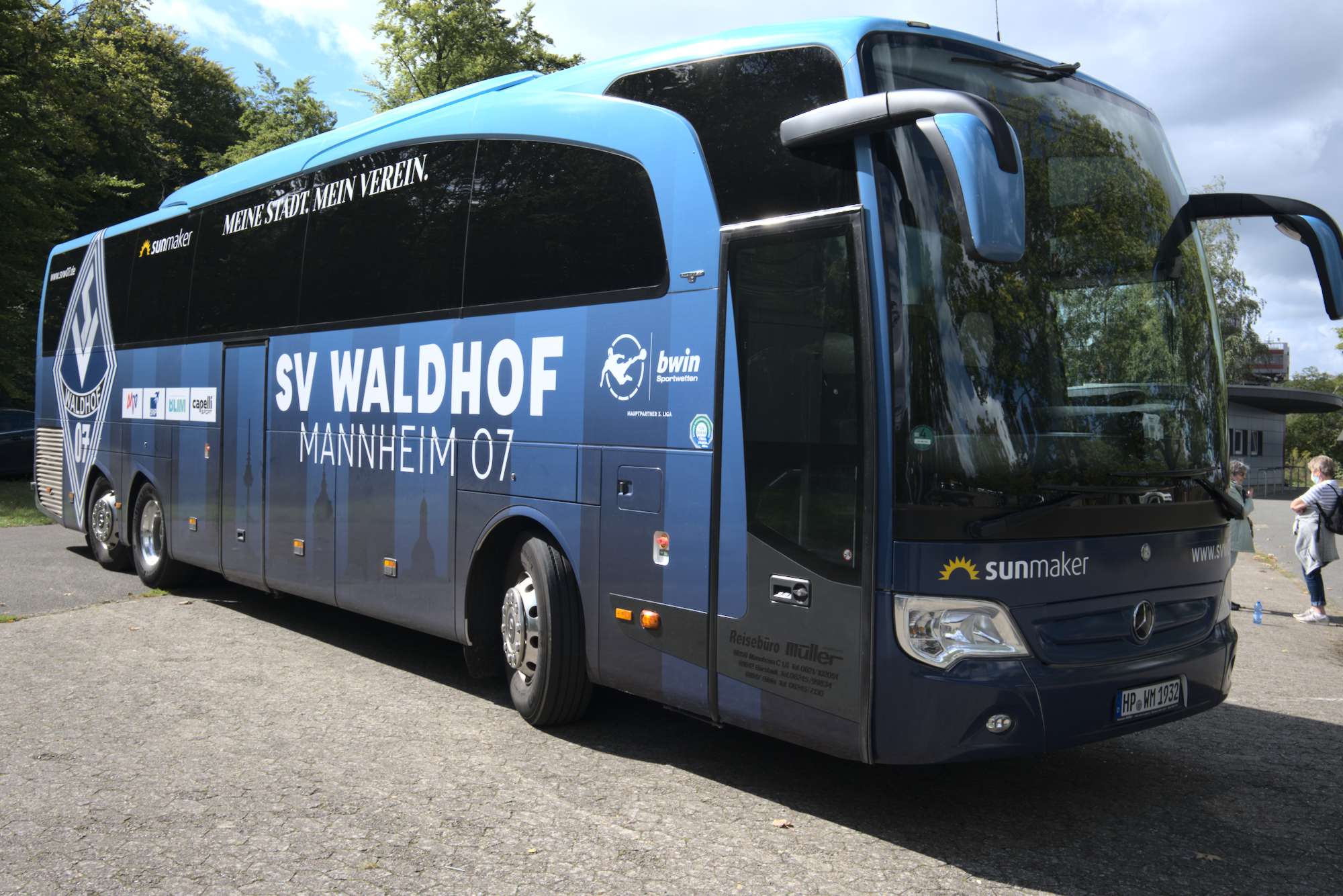 Auf dem Parkplatz der Mannschaftsbus der Waldhof Buwe, zur Zeit mit Rentnern unterwegs.