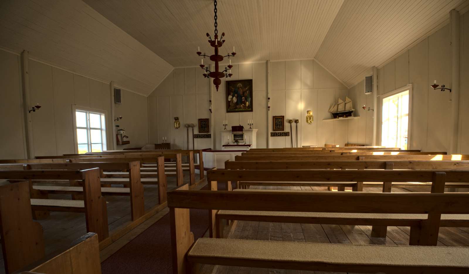 Eine Fischerkirche. Davor viele Bänke und Tische und ein Haus mit Küche usw. Nach dem Gottesdienst, gibt es Kaffee
