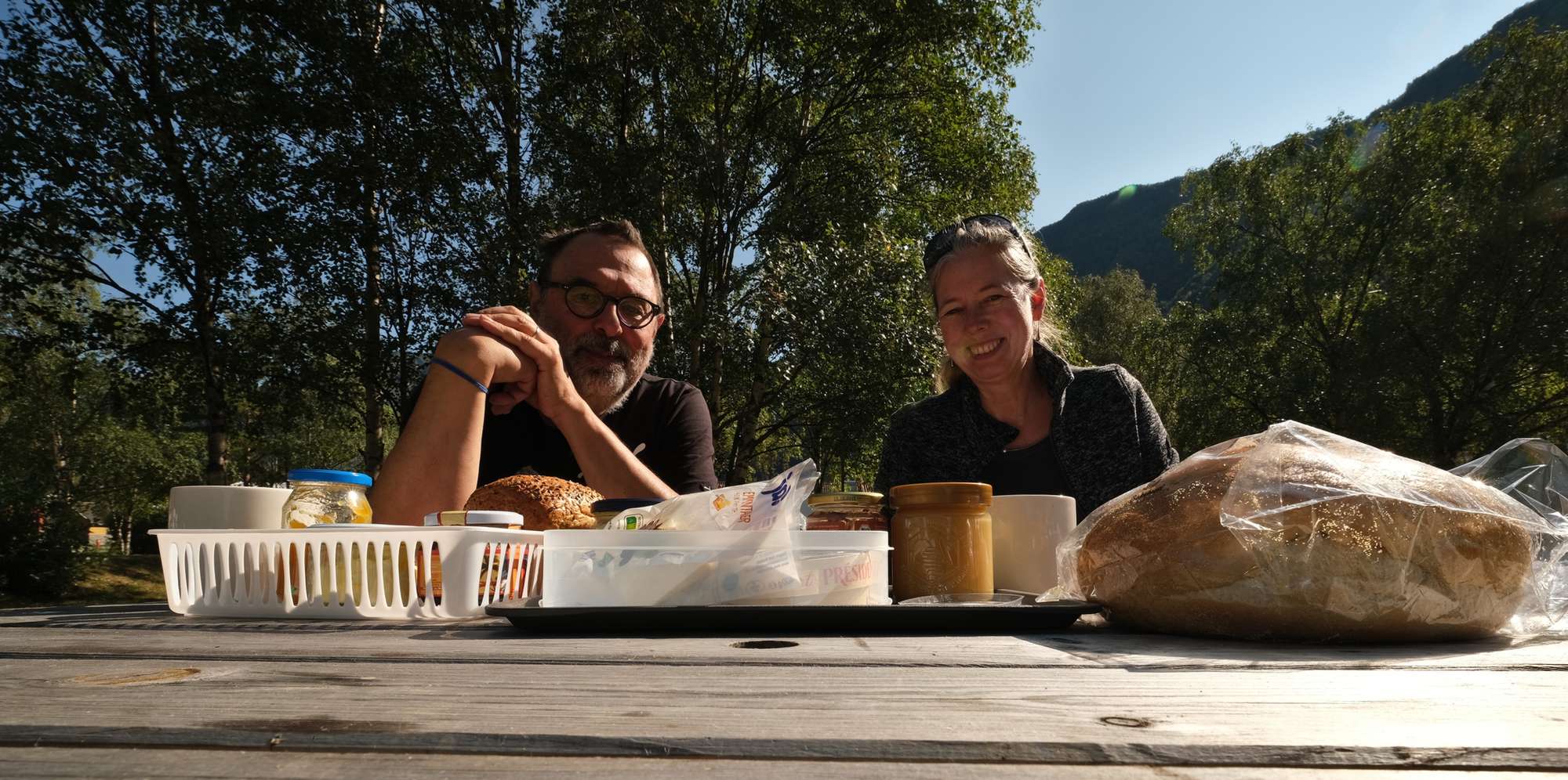 Das Wetter ist sonnig und warm. In Lærdalsøyri können wir draußen das leckere Frühstück am