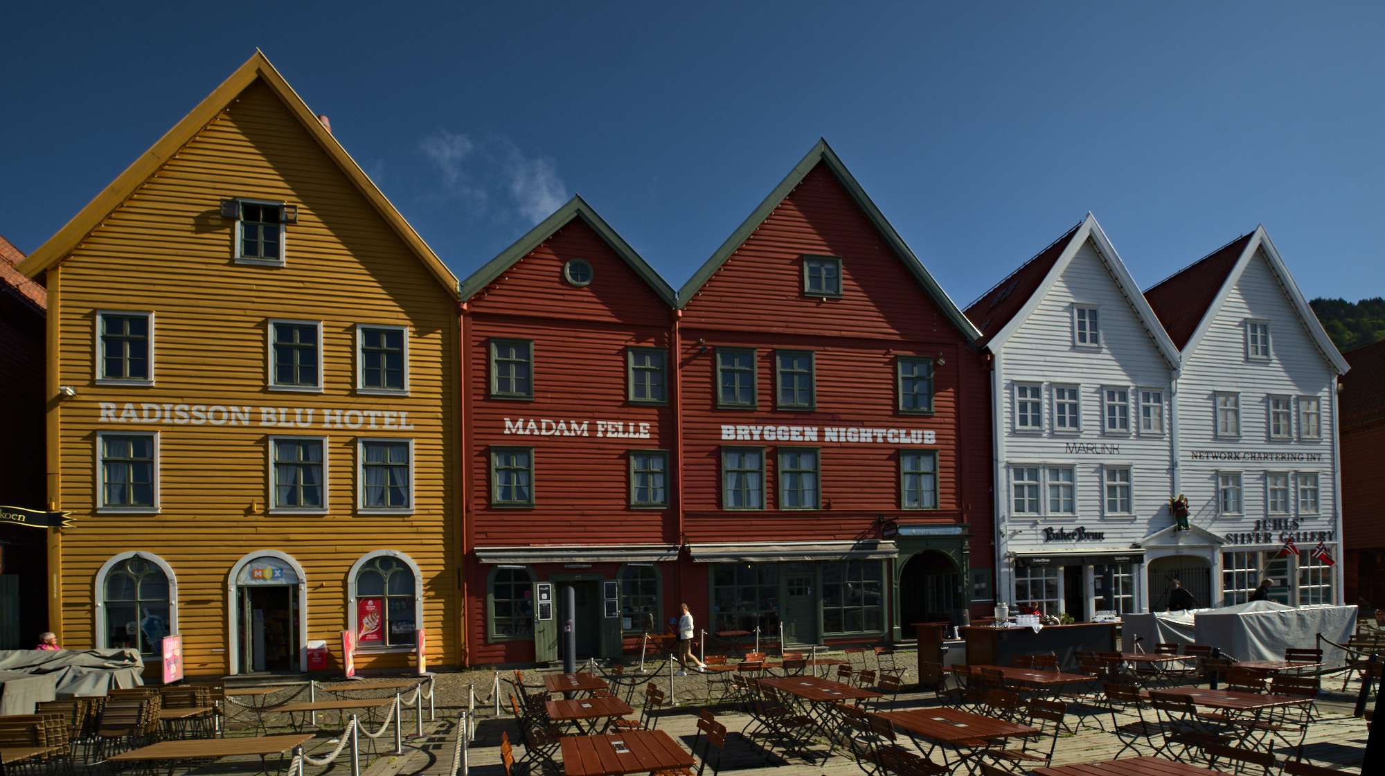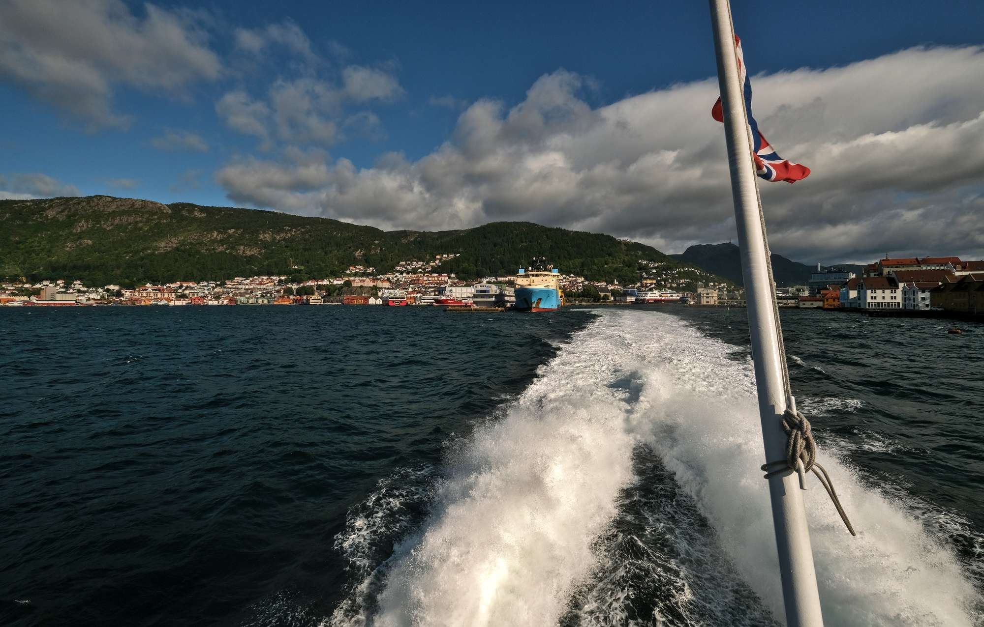 Mit unserem ÖPNV-Tagesticket können wir auch die Personenfähre auf dem Byfjorden nutzen. Noch einmal toller Blick auf das Hanseviertel, dann geht es mit Vollstoff über den Fjord.