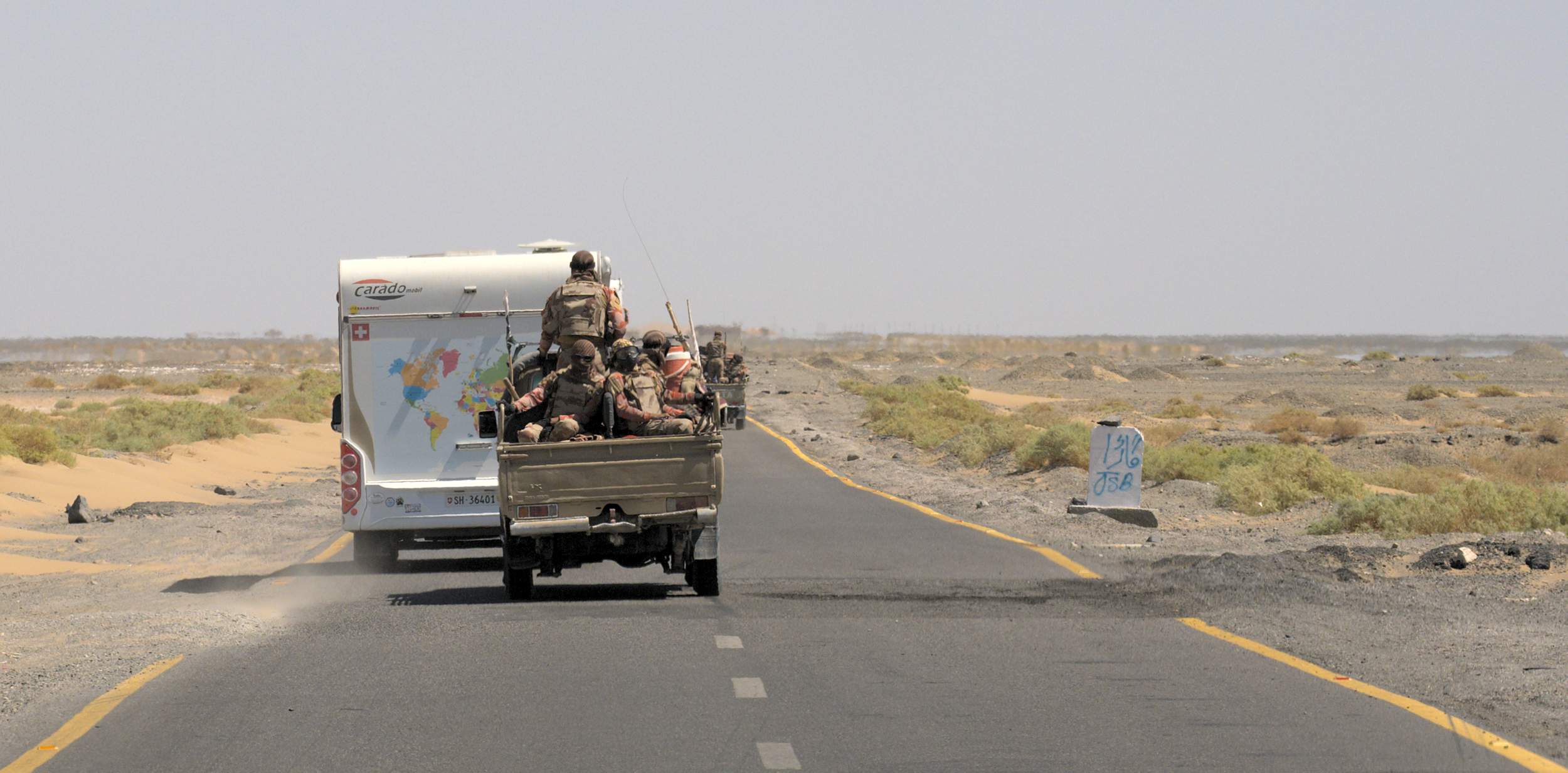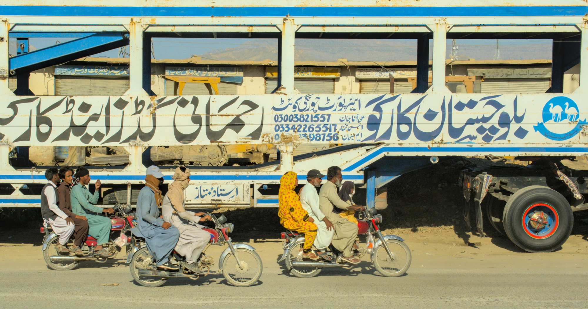 Während dreier Tage durch Belutschistan an der afghanischen Grenze entlang müssen wir weiter Kolonne fahren und werden rund um die Uhr von der Polizei bewacht. Nachts stehen wir auf umzäuntem Gelände. Einkaufen usw. ist nicht drin, die Ordnungshüter geben den Takt vor. Außer an den vielen Straßensperren, beim häufigen Wechsel der Polizisten und zum täglichen Tanken halten wir tagsüber nicht an.