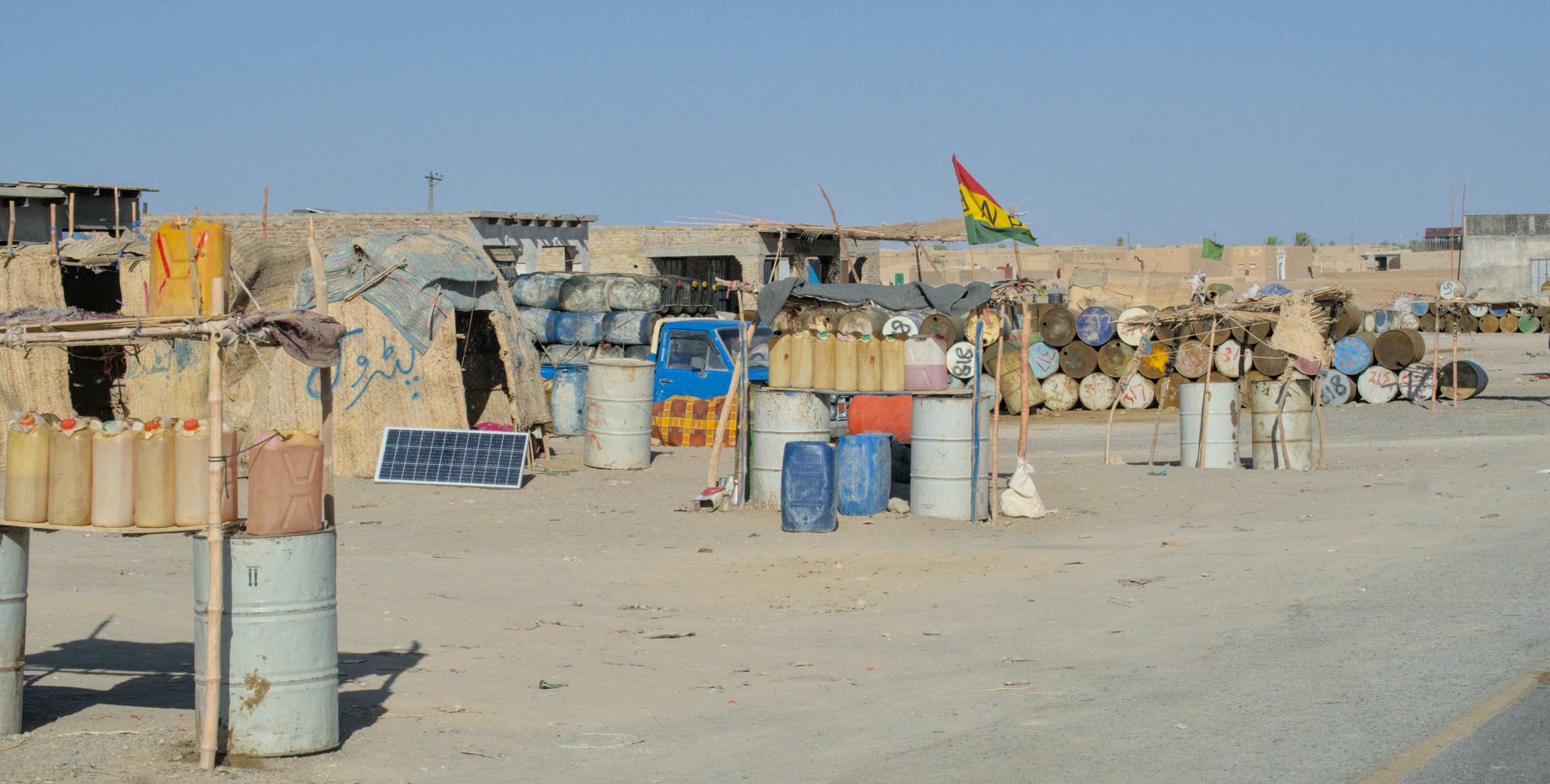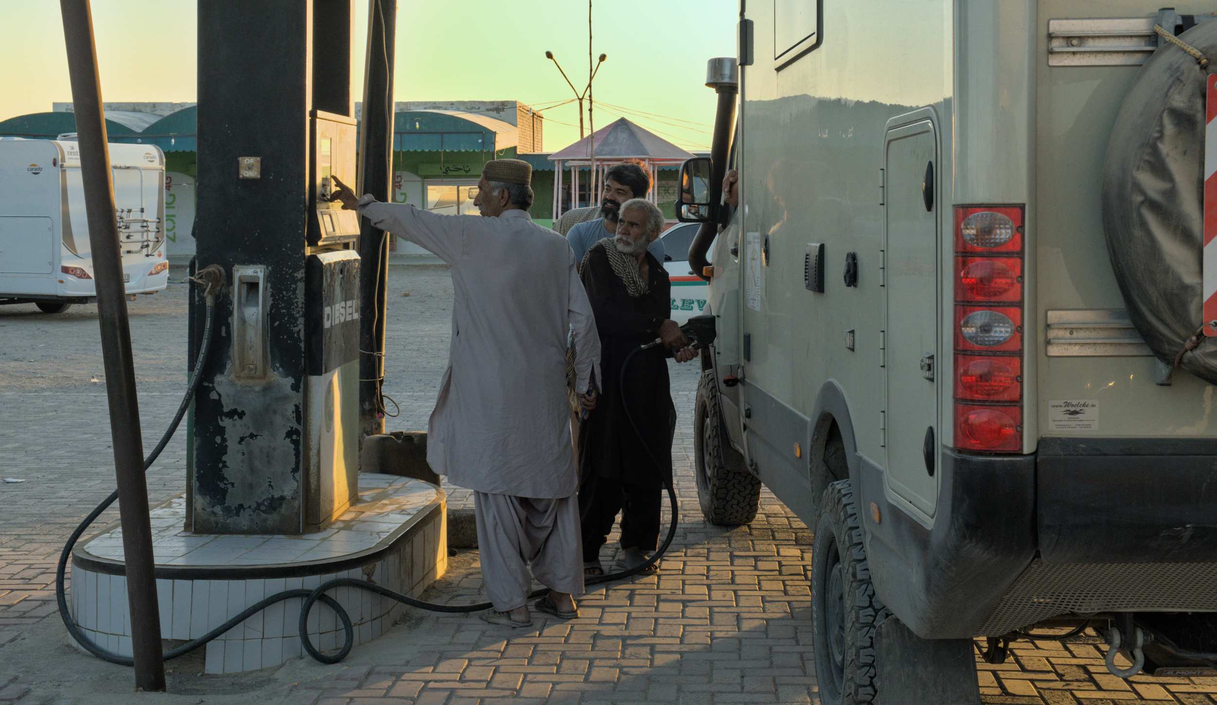 Auf den ersten paar hundert Kilometern gibt es überall geschmuggelten Kraftstoff aus dem Iran. Wir nehmen lieber den pakistanischen, weil der eine bessere Qualität hat.