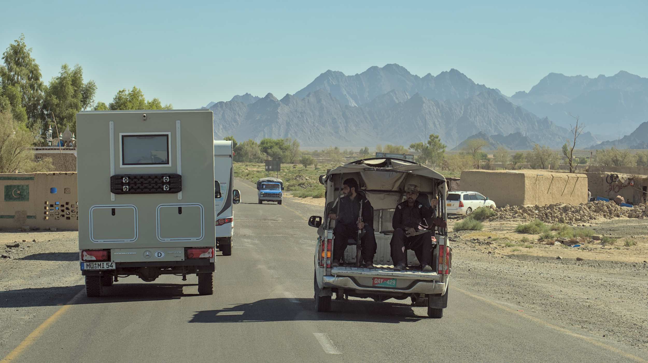 In Pakistan angekommen, müssen wir in Kolonne weiterfahren und werden von einer Polizeieskorte bewacht. Hier überholt uns allerdings das Militär, das generell sehr präsent ist.