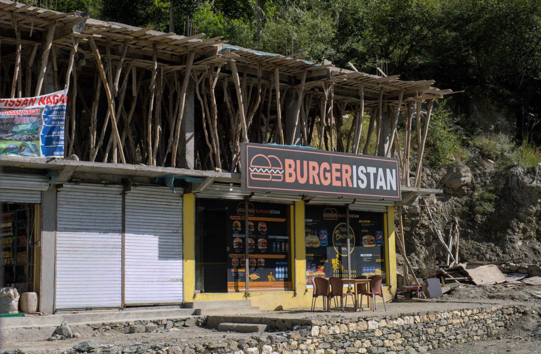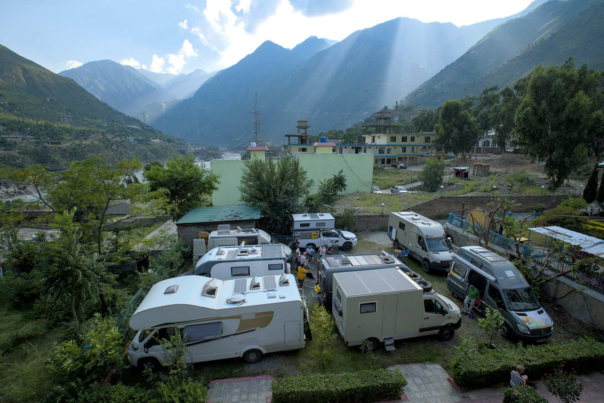 In Besham stehen wir eng gestapelt an einem Hotel. Hier die kleineren Exemplare, die eine enge steile Zufahrt bewältigen konnten.