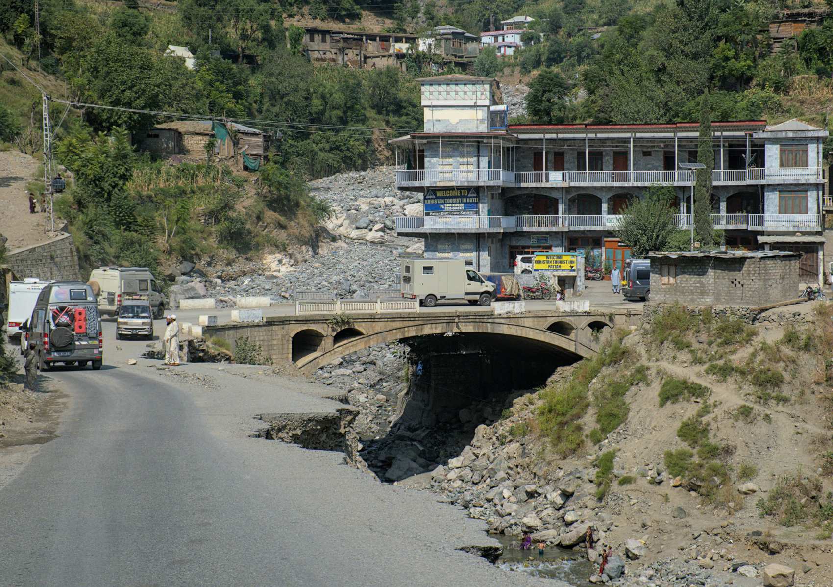 Hier hat es die ganze Brücke samt Pfeilern weggerissen. Hundert Meter flußauf geht es über eine Behelfsbrücke hinüber.