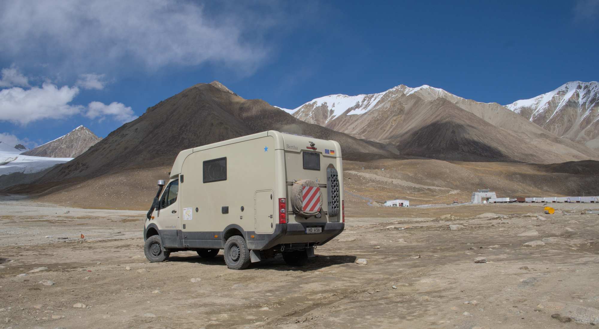 Wir sind oben auf dem höchsten Punkt des Karakorum-Highways, dem Khunjerab-Pass mit 4693 m. Dieser Grenzübergang zwischen Pakistan und China ist der höchstgelegene, befestigte Grenzübergang der Welt, aber wegen Corona für uns zur Zeit nicht passierbar.