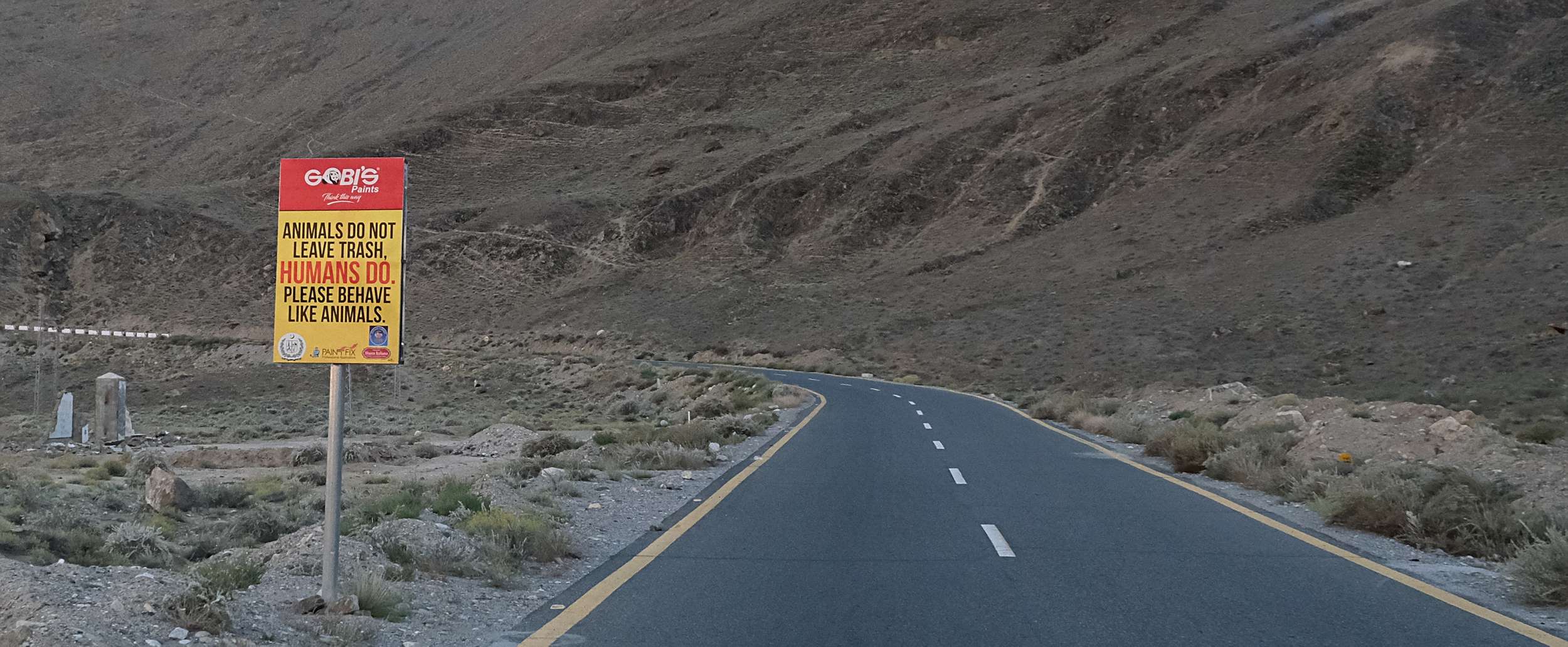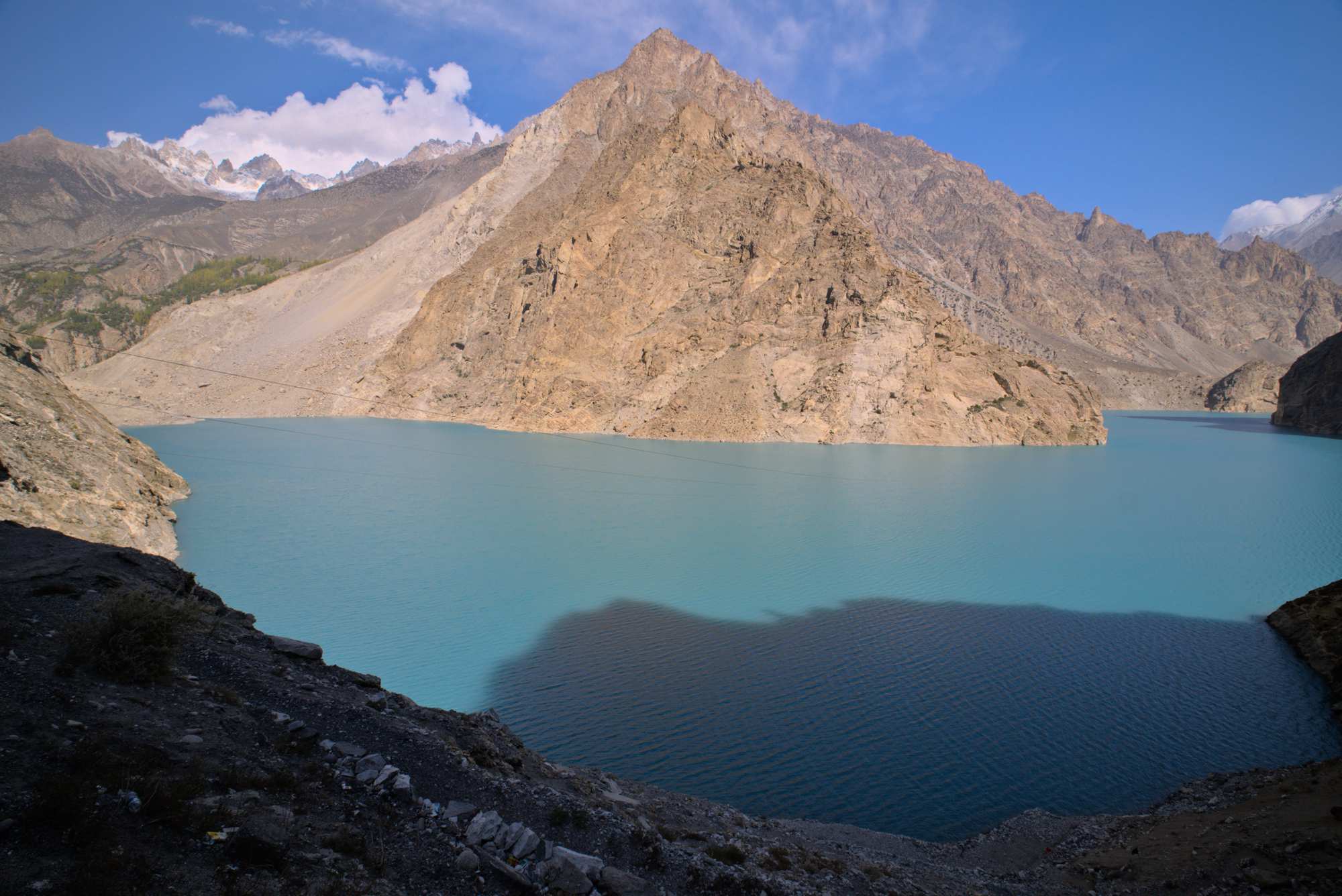 Auf der Rückfahrt nach Gilgit kommen wir noch einmal am Attabadsee vorbei, der durch diesen riesigen Felssturz (helles Gestein) im Januar 2010 entstanden ist. Dadurch war auch der Karakorum-Highway nicht mehr befahrbar. Ein Bootsverkehr wurde eingerichtet und kleinere Fahrzeuge recht abenteuerlich "verschifft". Die Chinesen, die in Pakistan generell sehr engagiert sind und auch diese Fernstraße gebaut haben, stellten fünf Jahre später durch mehrere Tunnel die Verbindung wieder her.