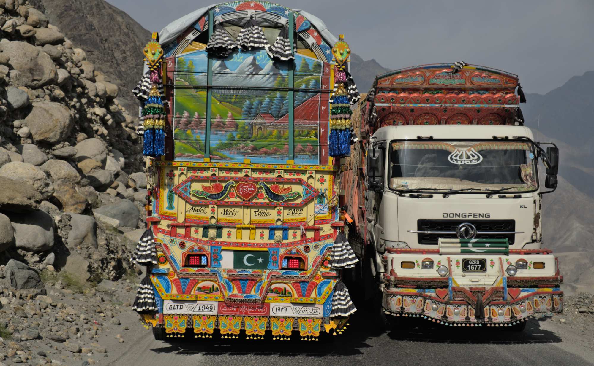 Fahrt am Abend, ziemlich abenteuerlich die bunten LKWs, die Fahrweise und die Strecke. Auch tagsüber geht es mitunter recht eng zu.