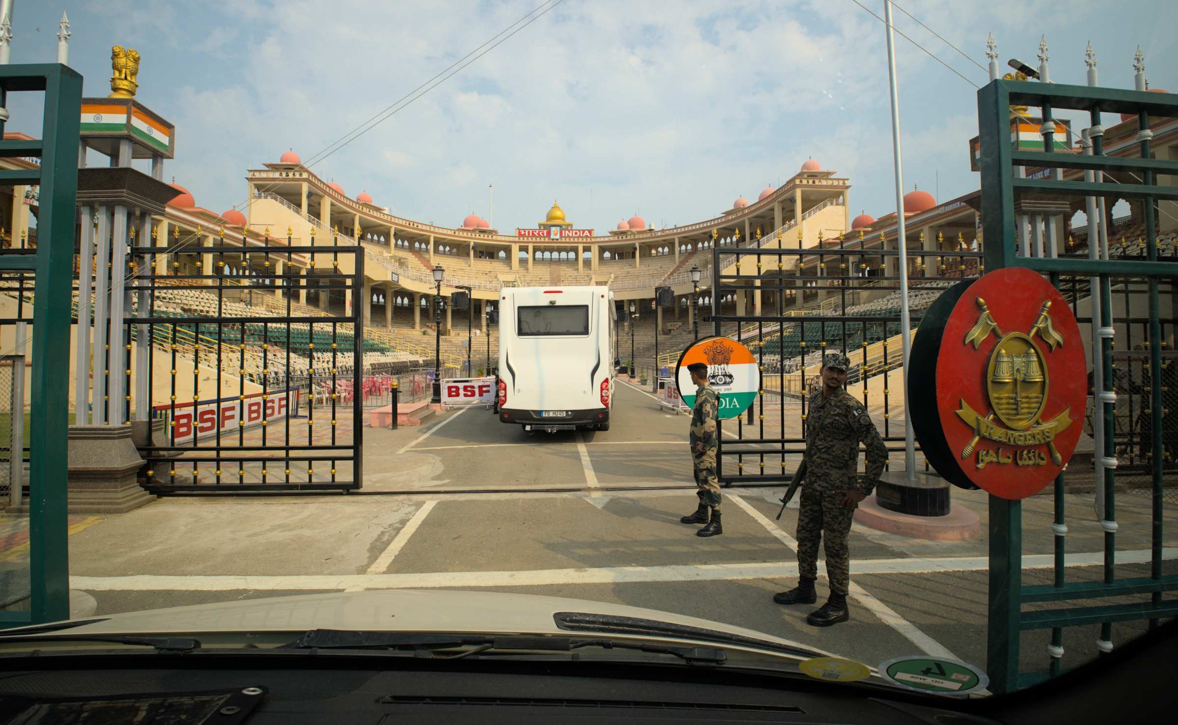 Nach den Ausreiseformalitäten in Pakistan passieren wir dann diesen berühmten Grenzübergang. Selbst durch die Stadien und Tore zu fahren ist schon ganz besonders.