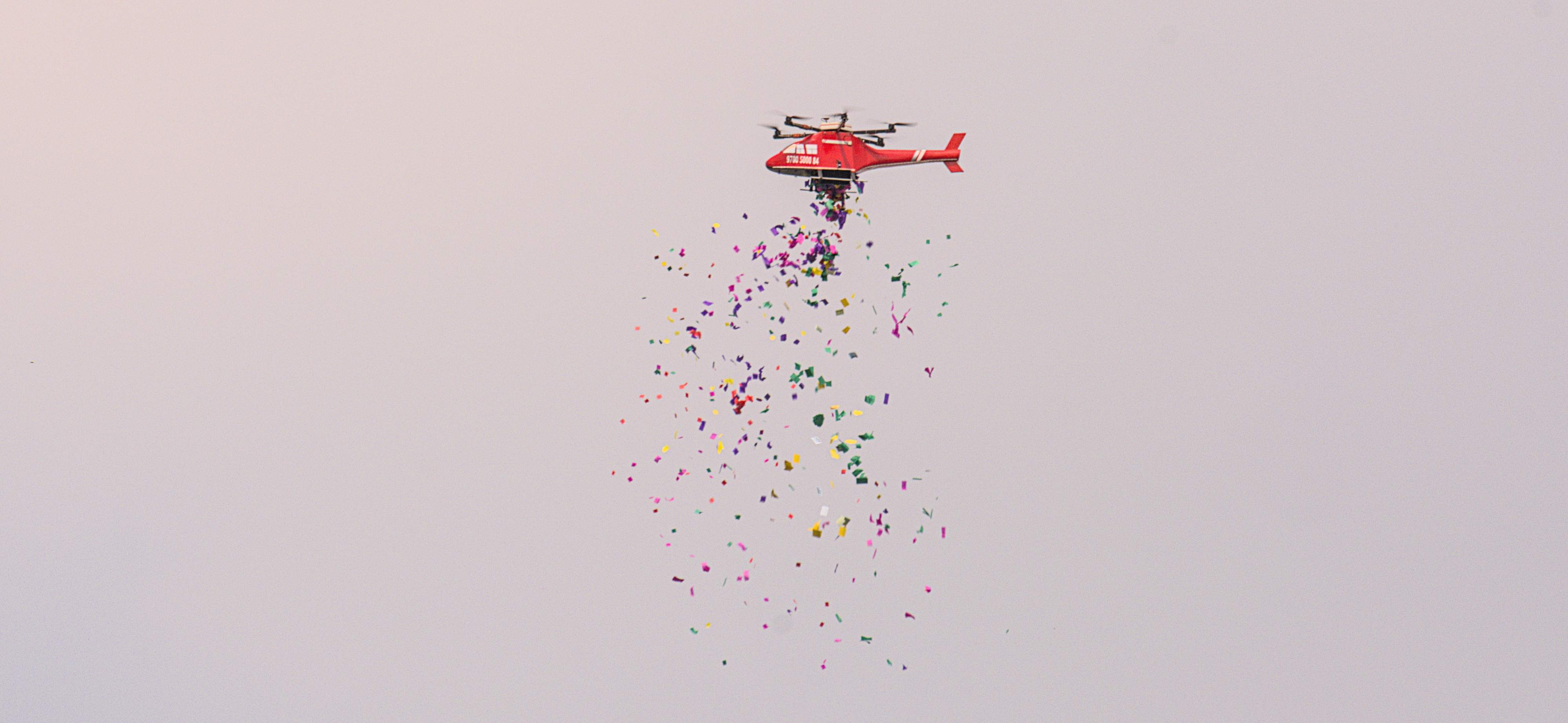 Irgendwie typisch indisch: eine Helikopter-Drohne wirft bunte Schnipsel neben dem Tempel vom Himmel...