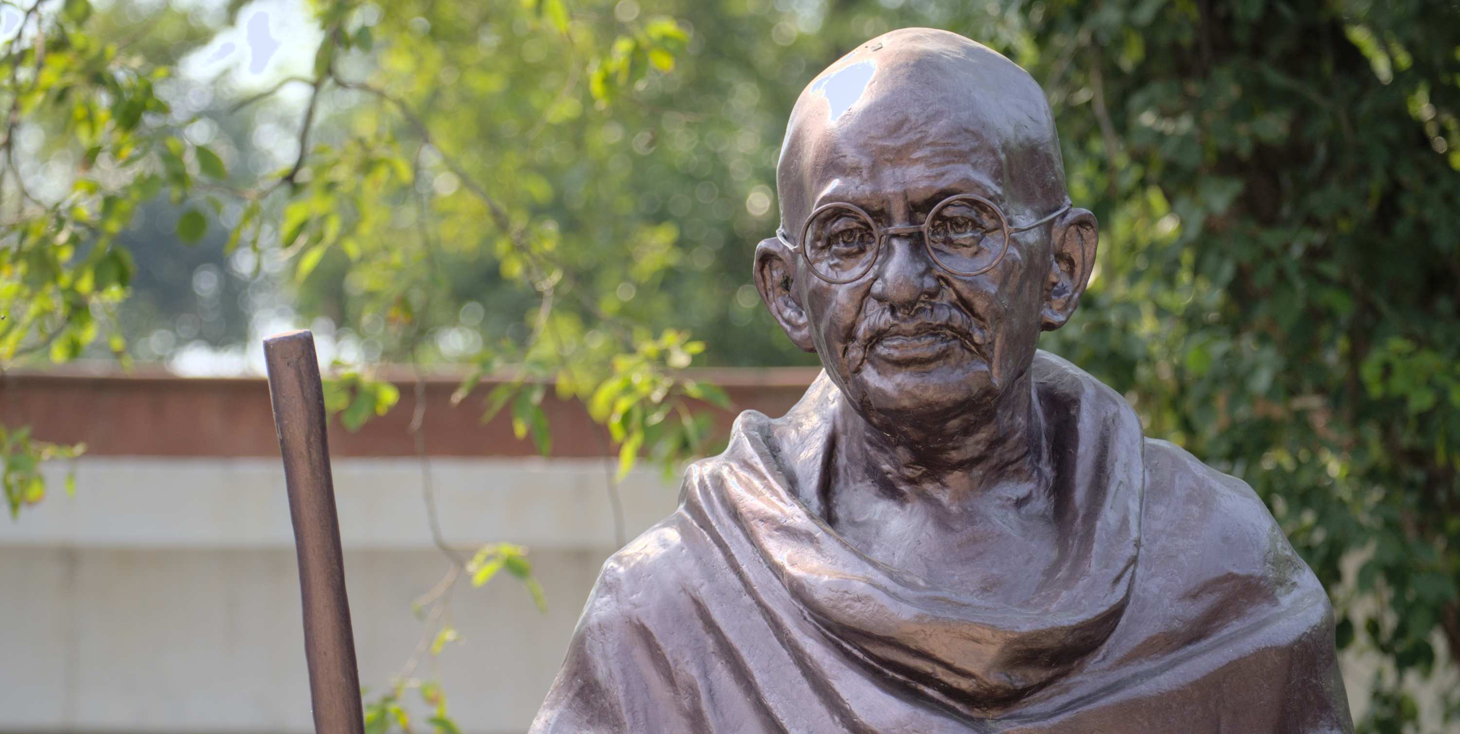 Statue Mahatma Gandhis in der Raj Ghat Gedenkstätte. Sein Leichnam wurde hier 1948 verbrannt.