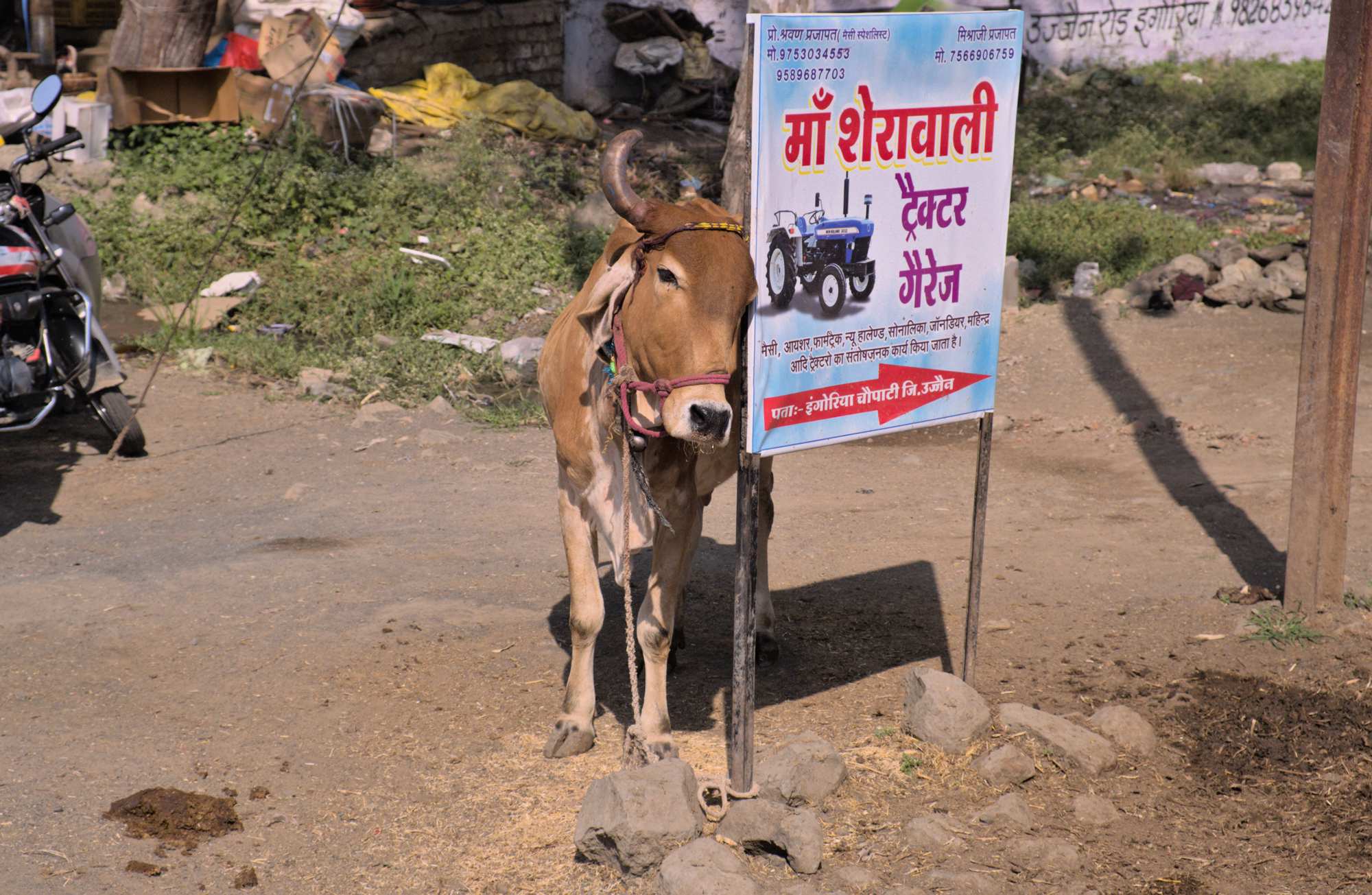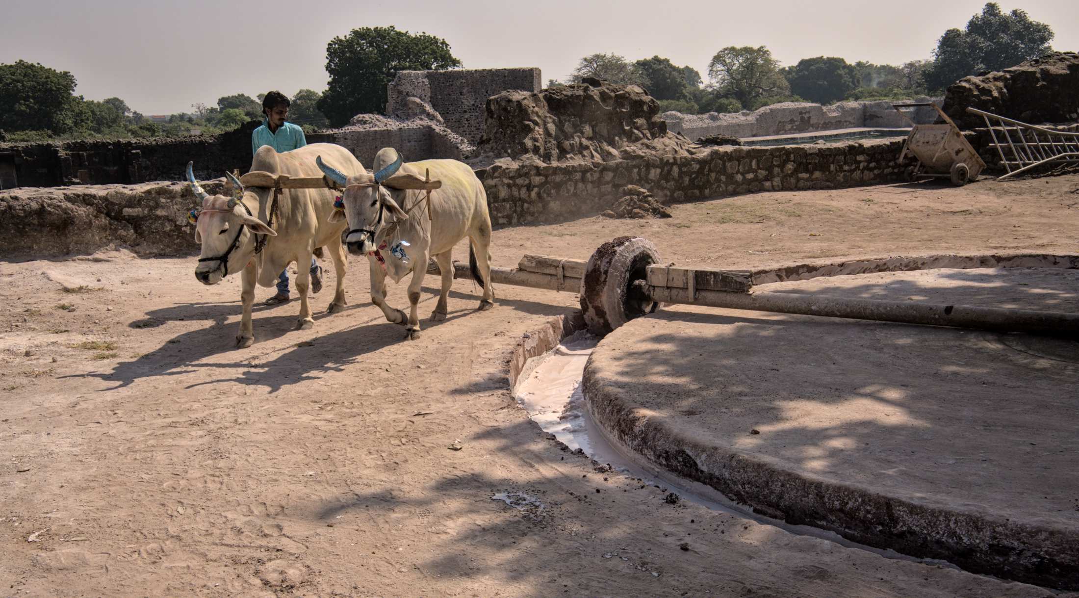 Blauhornkühe bei der Herstellung traditioneller Baustoffe, mit denen hier die Gebäude renoviert werden. Was genau da gemischt wird, haben wir nicht herausgefunden.