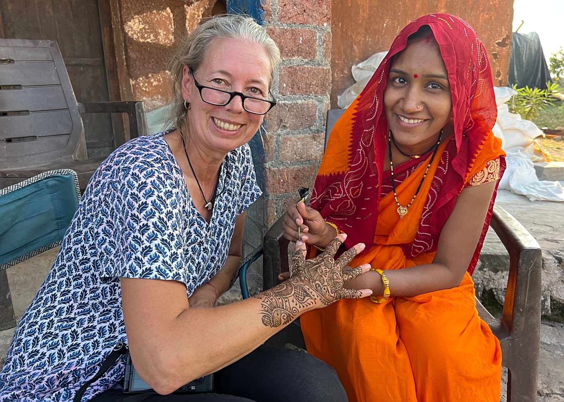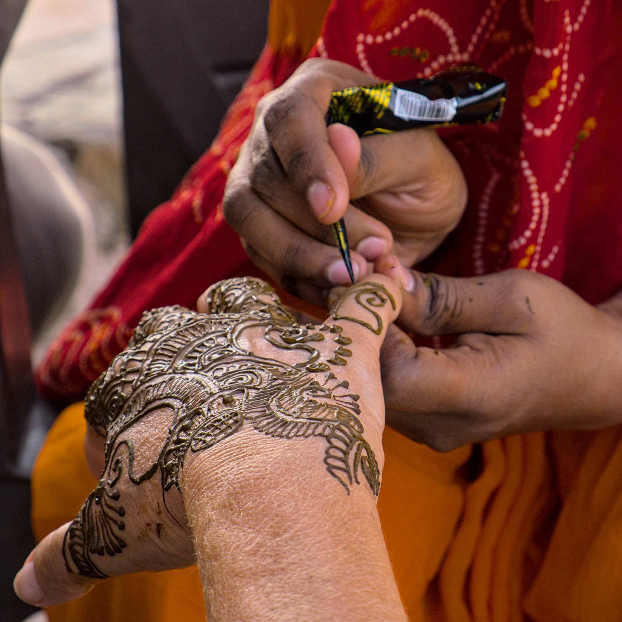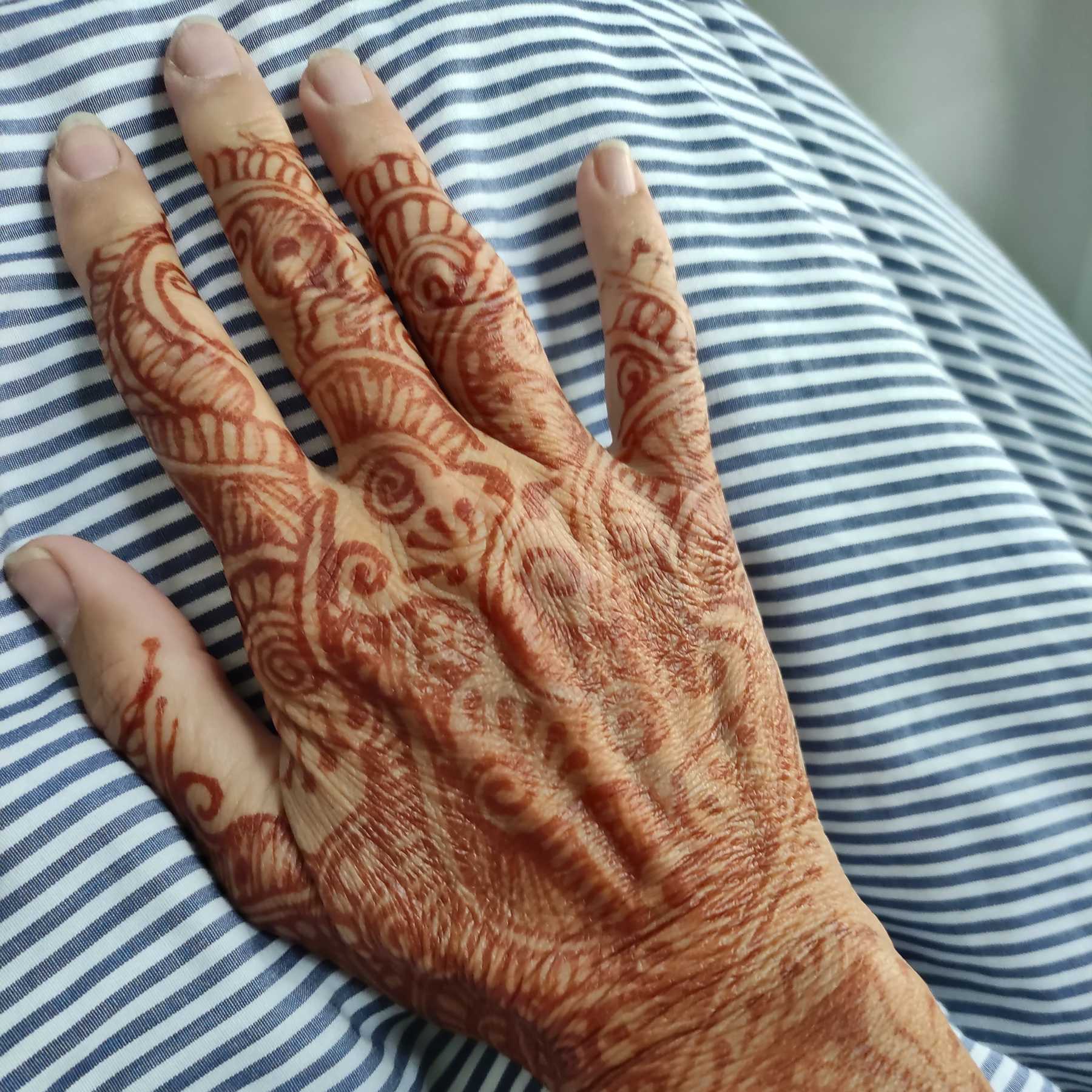 Kunstvoll wird Henna auf die Hände aufgetragen, anschließend eintrocknen lassen und abwaschen, fertig. Hält ungefähr eine Woche.