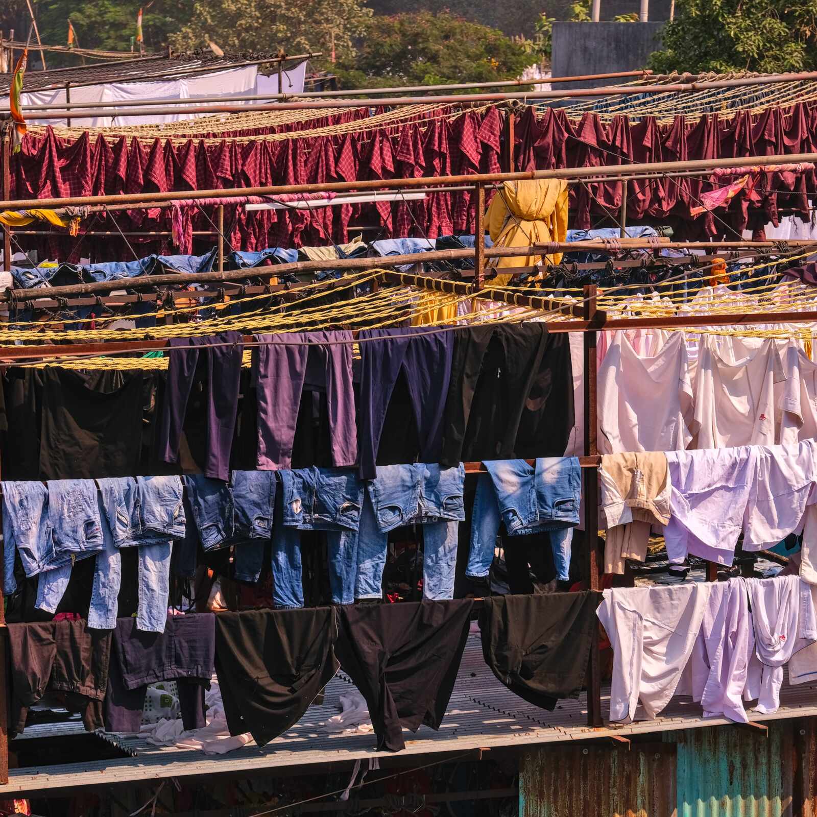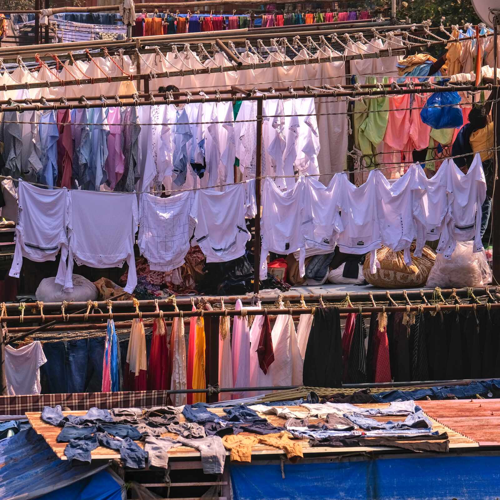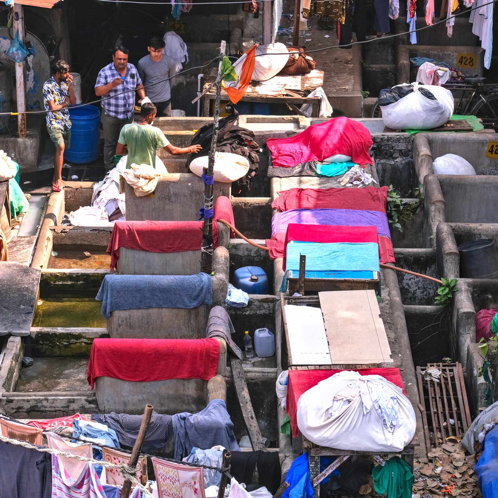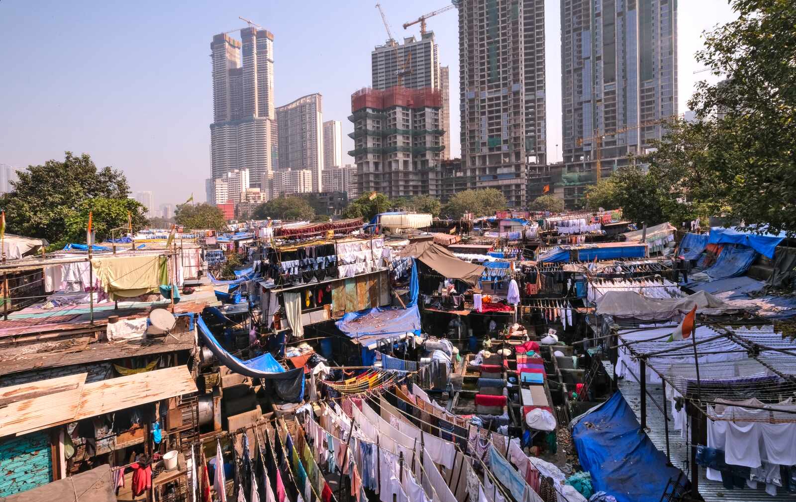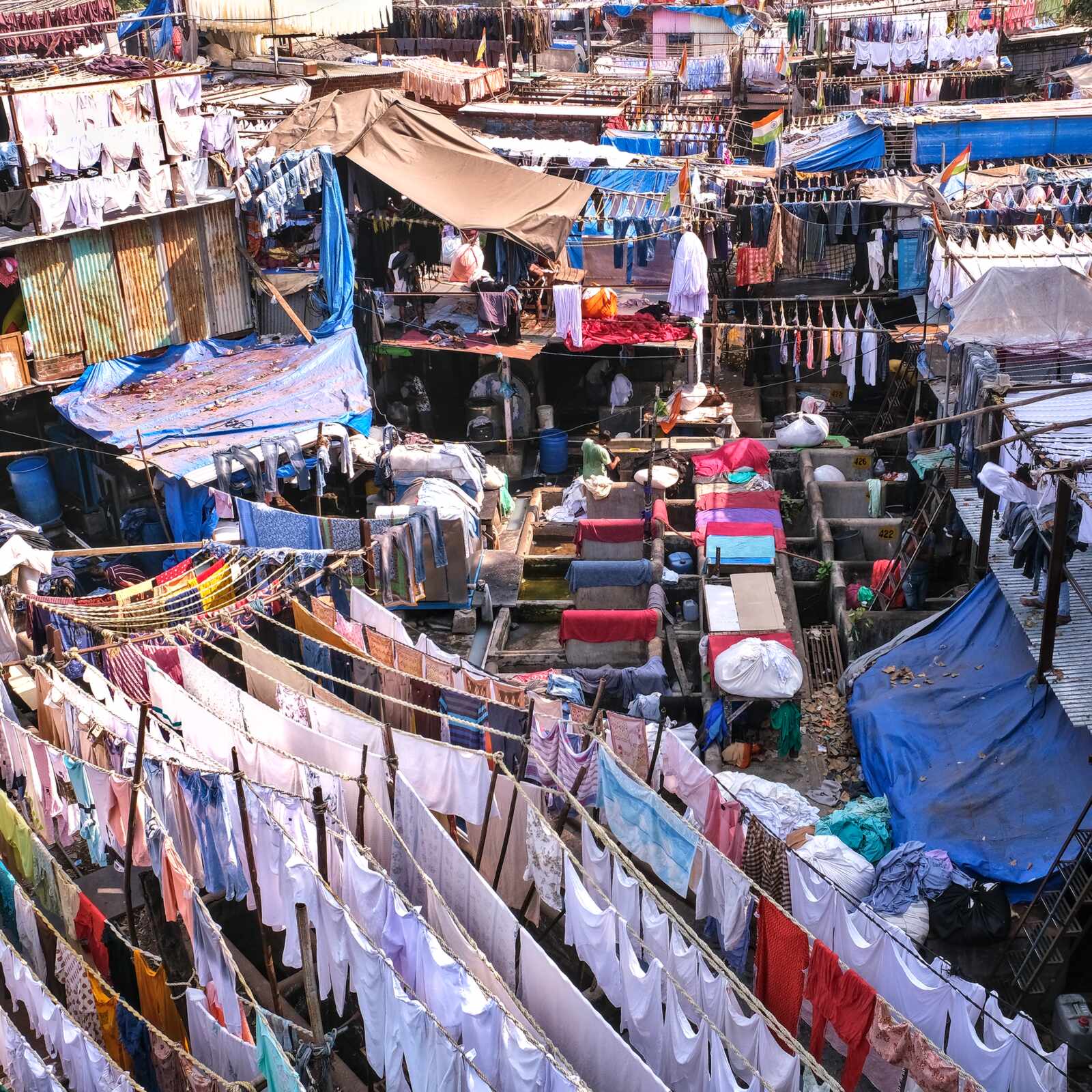 Das Wäschereiviertel Dhobi Ghat in Mumbai. Auf engstem Raum wird hier alles wieder sauber, strahlend weiß oder bunt.