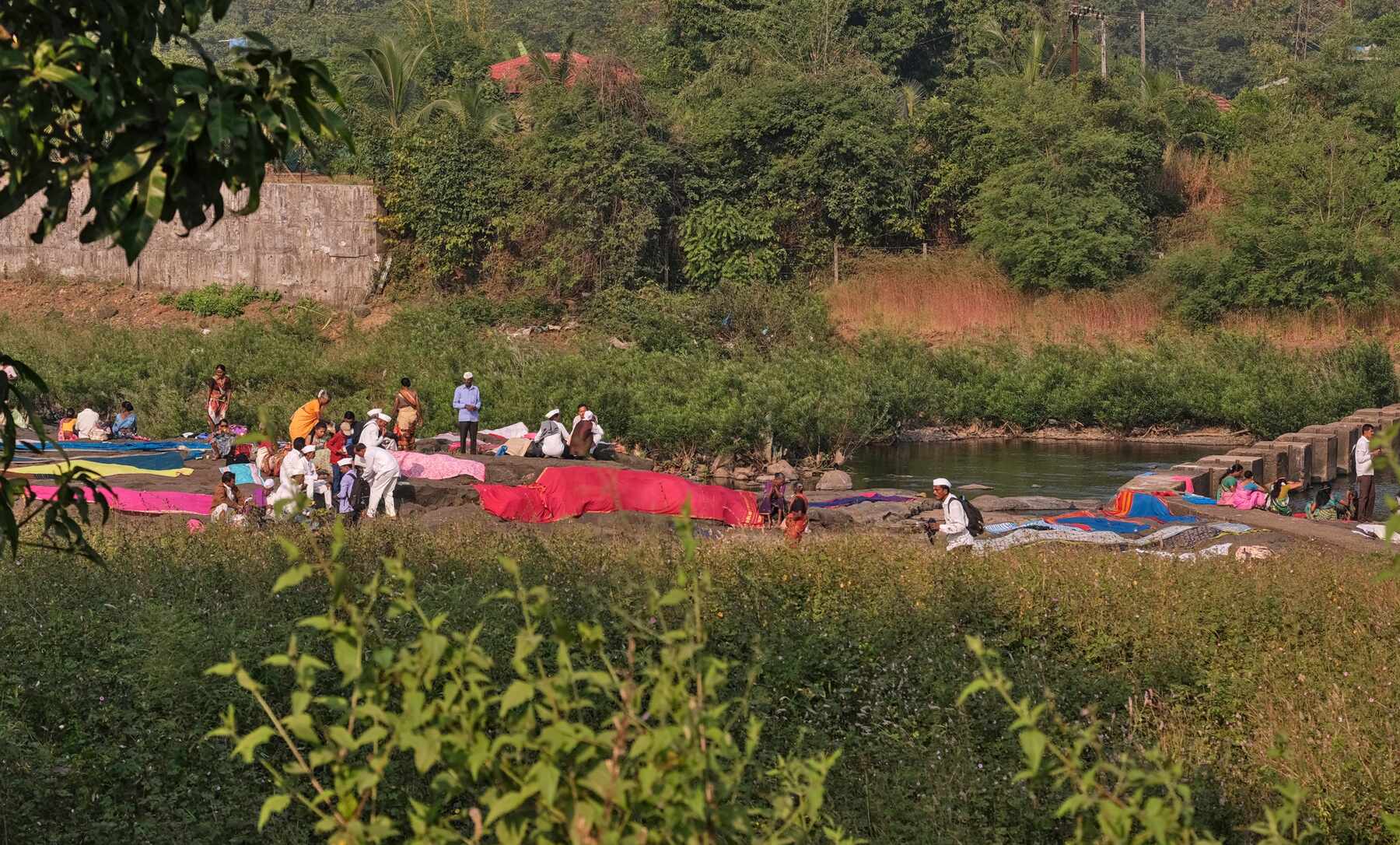 Saris waschen und trocknen am Fluss.