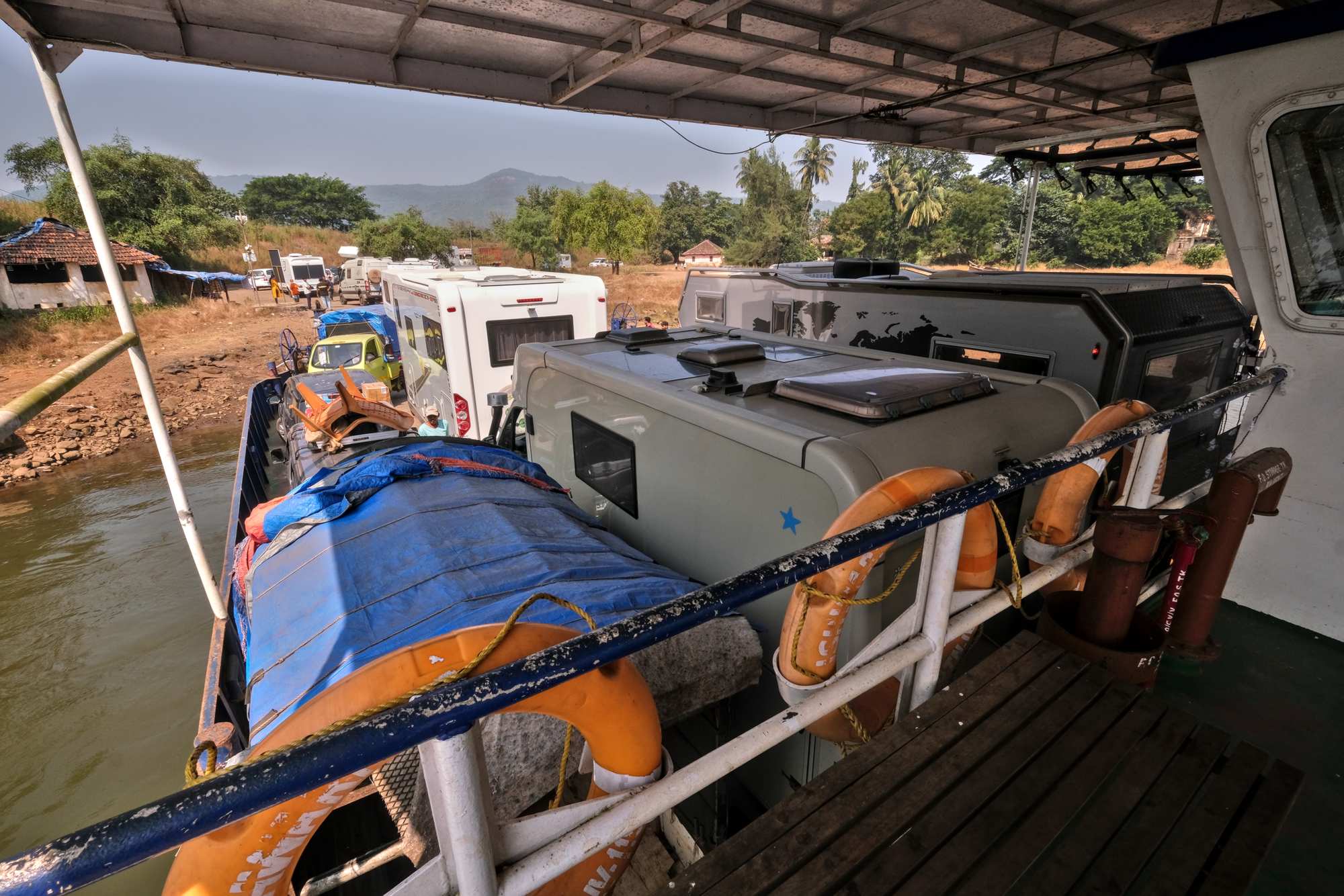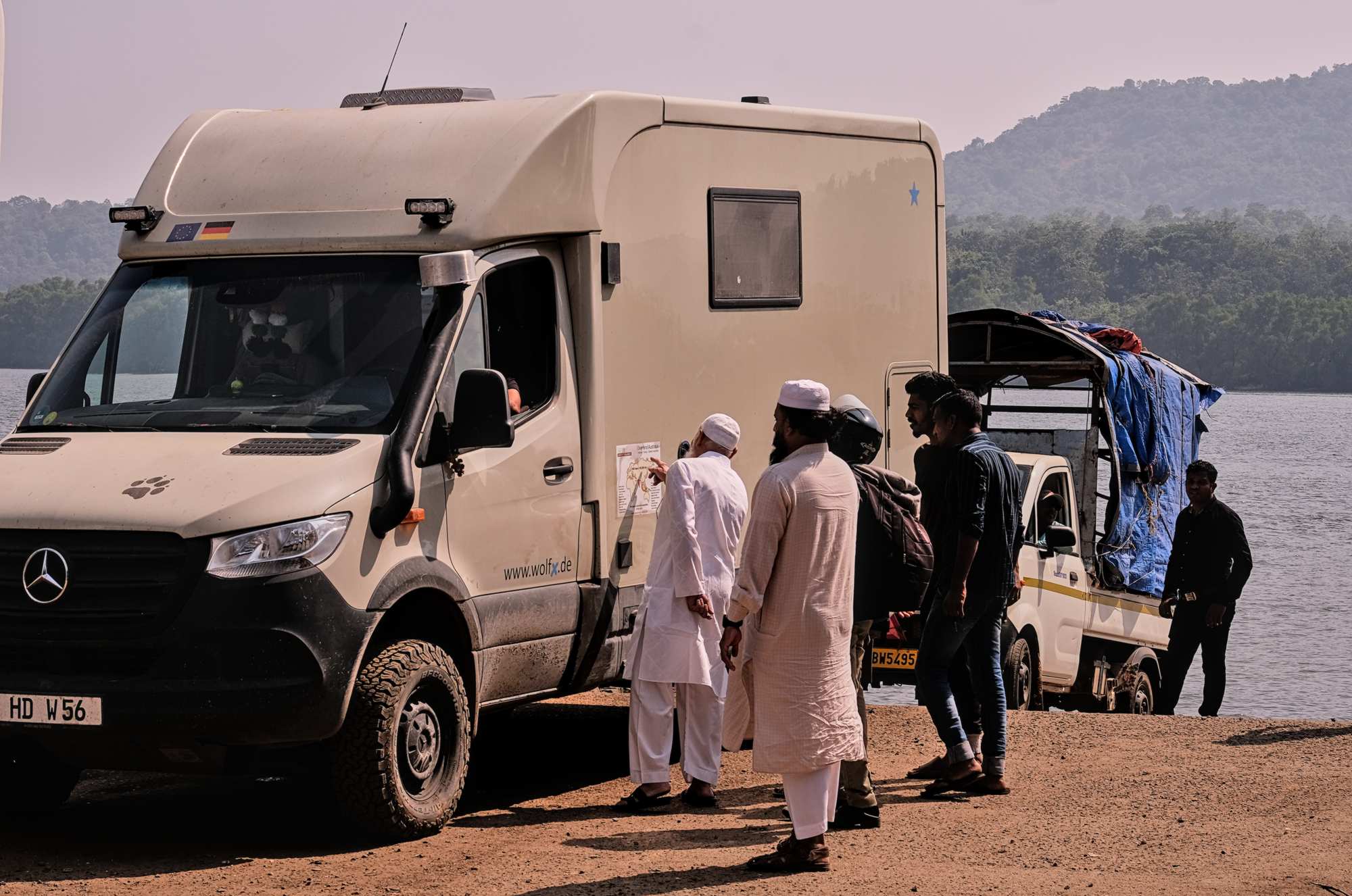 Wegen einer kaputten Flussbrücke müssen wir übersetzen. Beim Warten auf die Fähre ergeben sich nette Gespräche.