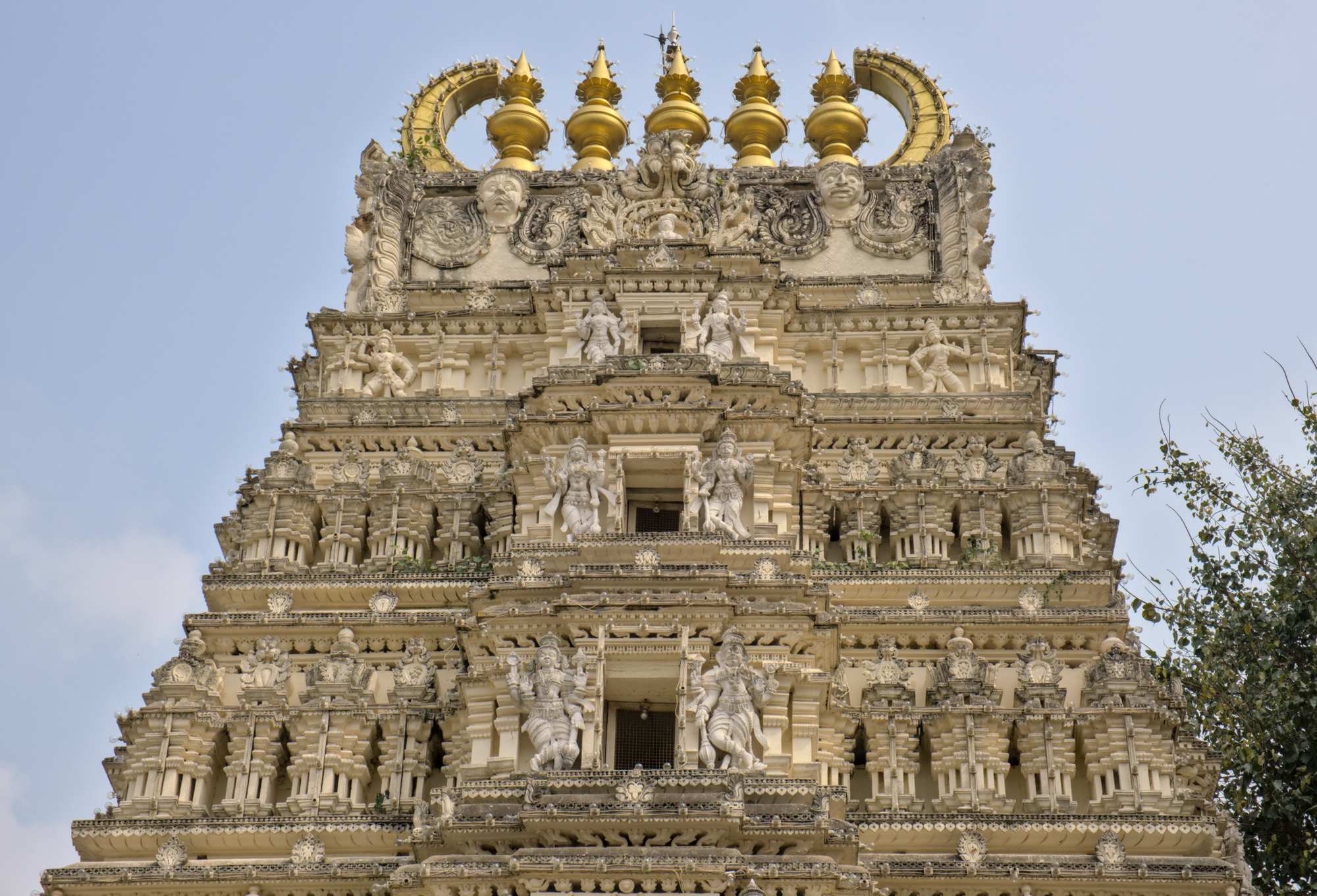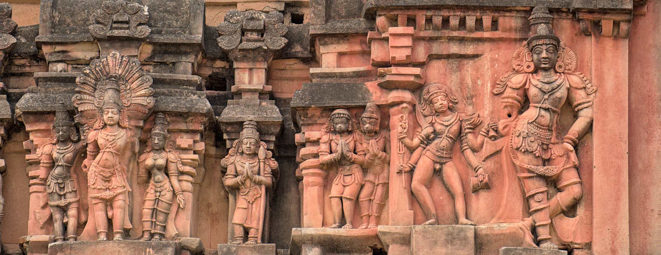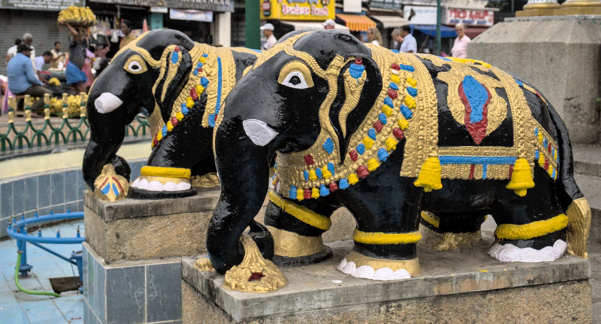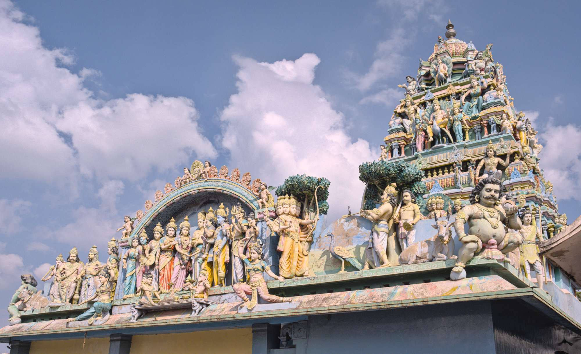 Neuer hinduistischer Tempel. Früher waren auch die alten historischen Tempel bunt, allerdings tragen die weiblichen Figuren heutzutage obenherum Kleidung, wie im wirklichen Leben.