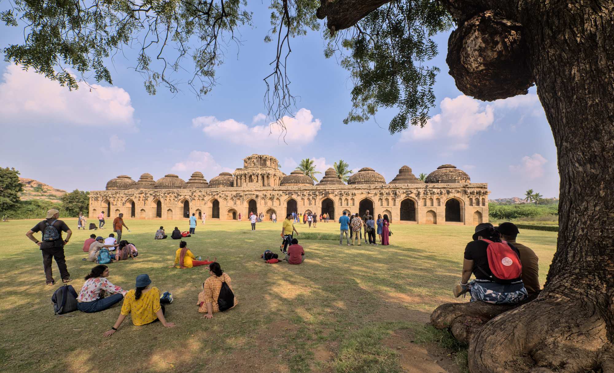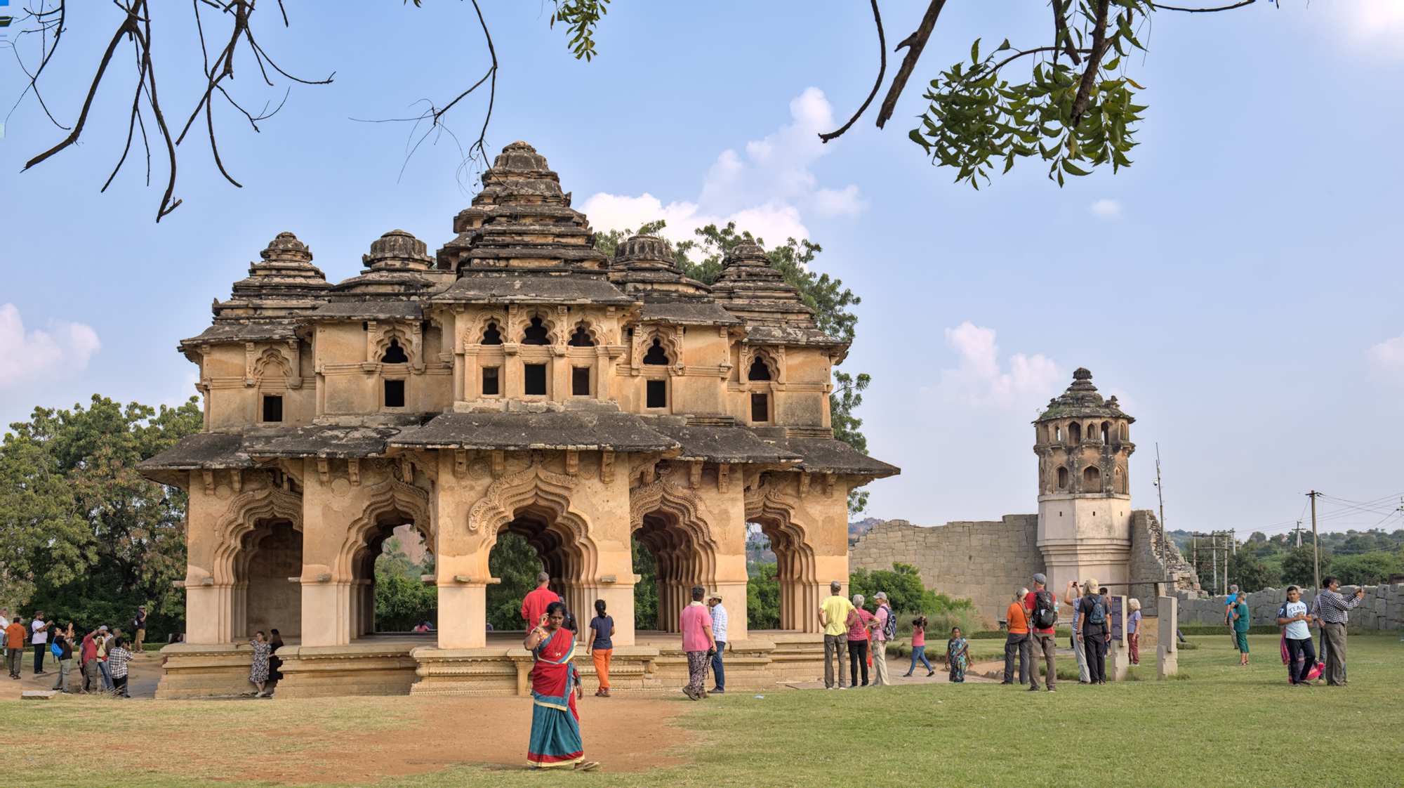 Lotus Mahal und Wach Tower. Daneben der Stall für die königlichen Elefanten. Die unterschiedlichen Dachhauben finden wir besonders interessant.