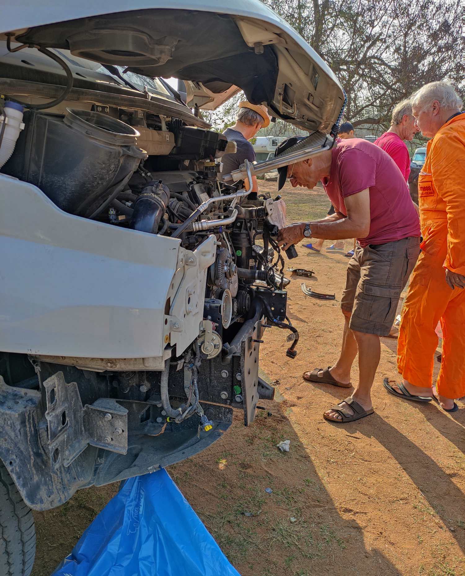 Nach einem Crash mit einem Wasserbüffel, der das nicht überlebt hat, im Gegensatz zu den gänzlich heil gebliebenen Insassen, wird bei dem betroffenen Iveco alles abgebaut, was kaputt ist. Der Kühler muss auch ersetzt werden und ob der Motor in Ordnung ist, wir sich dann zeigen. Die Ersatzteile werden in Deutschland bestellt und dort abgeholt. Ein Mitglied der Reiseleitung fliegt deswegen extra hin und zurück, was auch die Zollformalitäten erheblich vereinfacht. Die verzogene linke Halterung für die Frontteile wird mithilfe der Winde des Quads eines Teilnehmers wieder einigermaßen gerichtet. Bis die Teile da sind, warten Besitzer, Teamleitung plus Mechaniker vor Ort, der Rest der Gruppe fährt weiter. Insgesamt zwar teuer (Materialkosten, Flugkosten und der Büffel), aber es soll ja weitergehen...