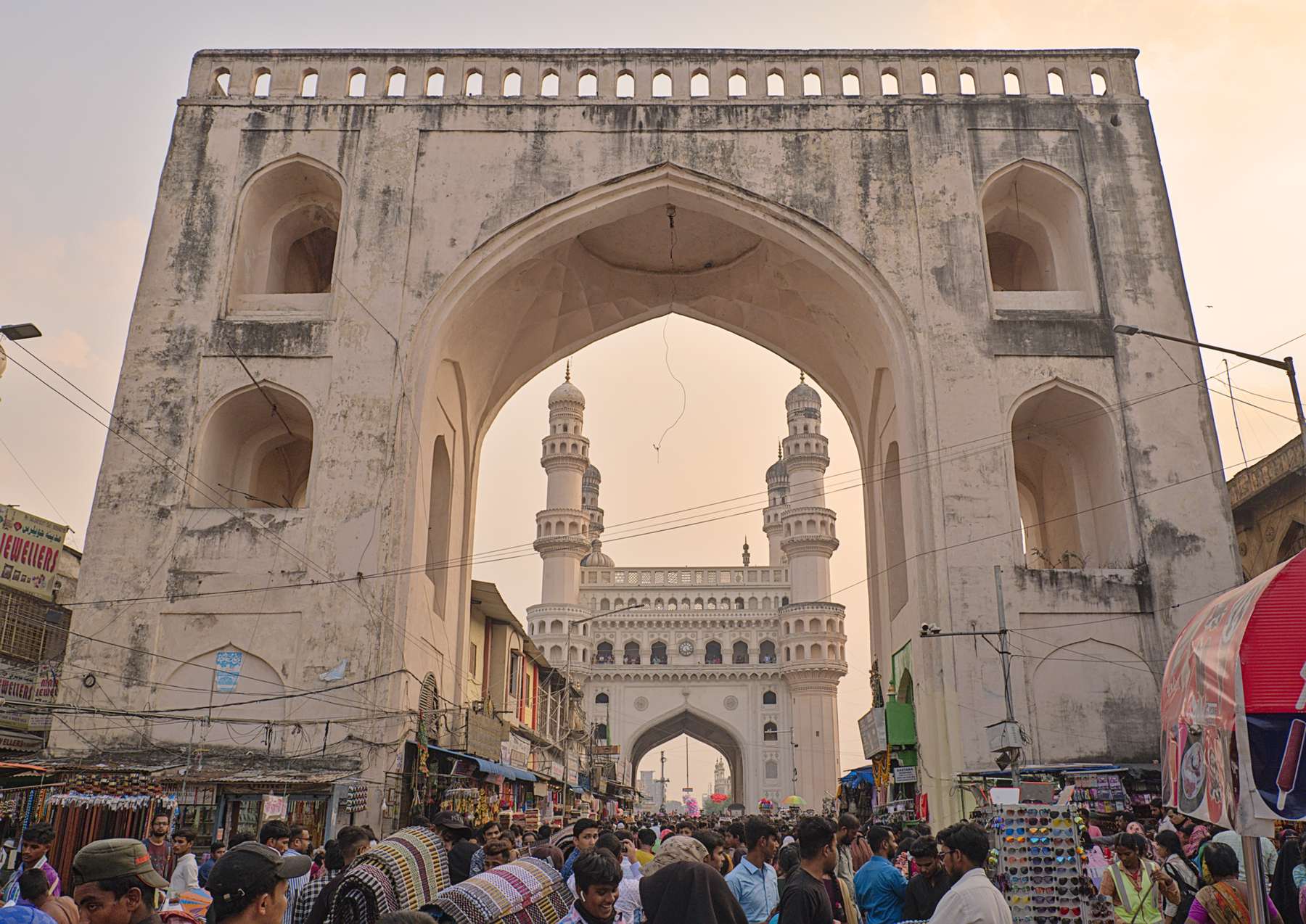 Das Charminar, Triumphbogen mit Moschee im Obergeschoss.