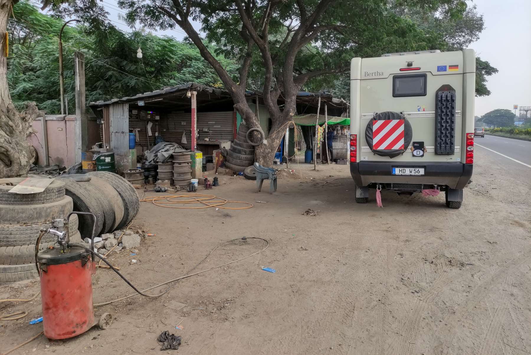 Übliche, schon recht große Reifenwerkstatt am Straßenrand. Der Luftdruck muss überprüft und angepasst werden. Zwei defekte Ventile werden getauscht.