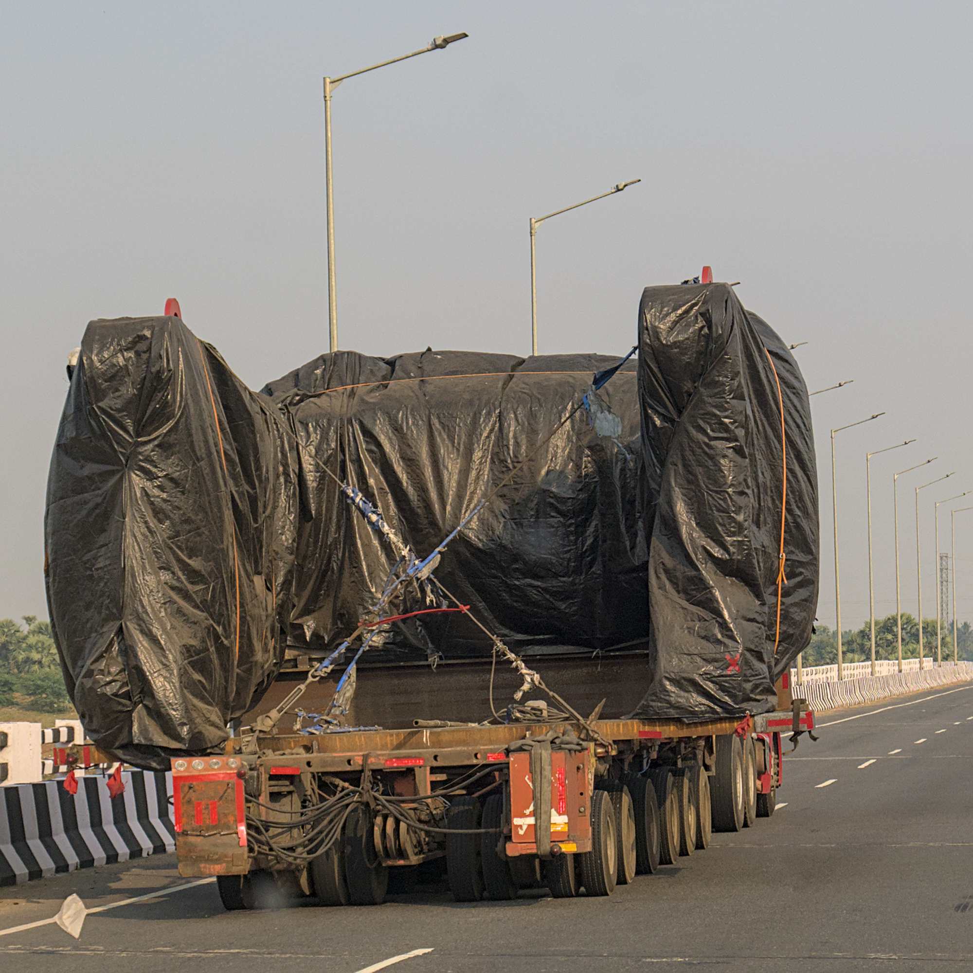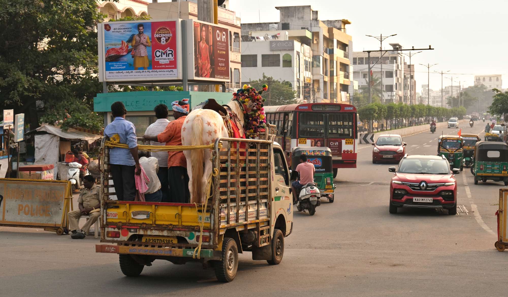 Was so alles transportiert wird: Schickes Pferd, fahrender Heuhaufen, etwas größere Reifen und in Überbreite irgendein Teil. Hier in Indien nicht mal besonders gekennzeichnet, geschweige denn von einem Begleitfahrzeug gesichert.