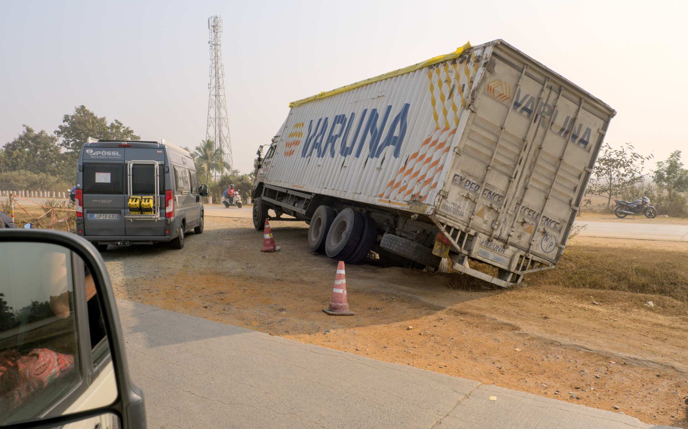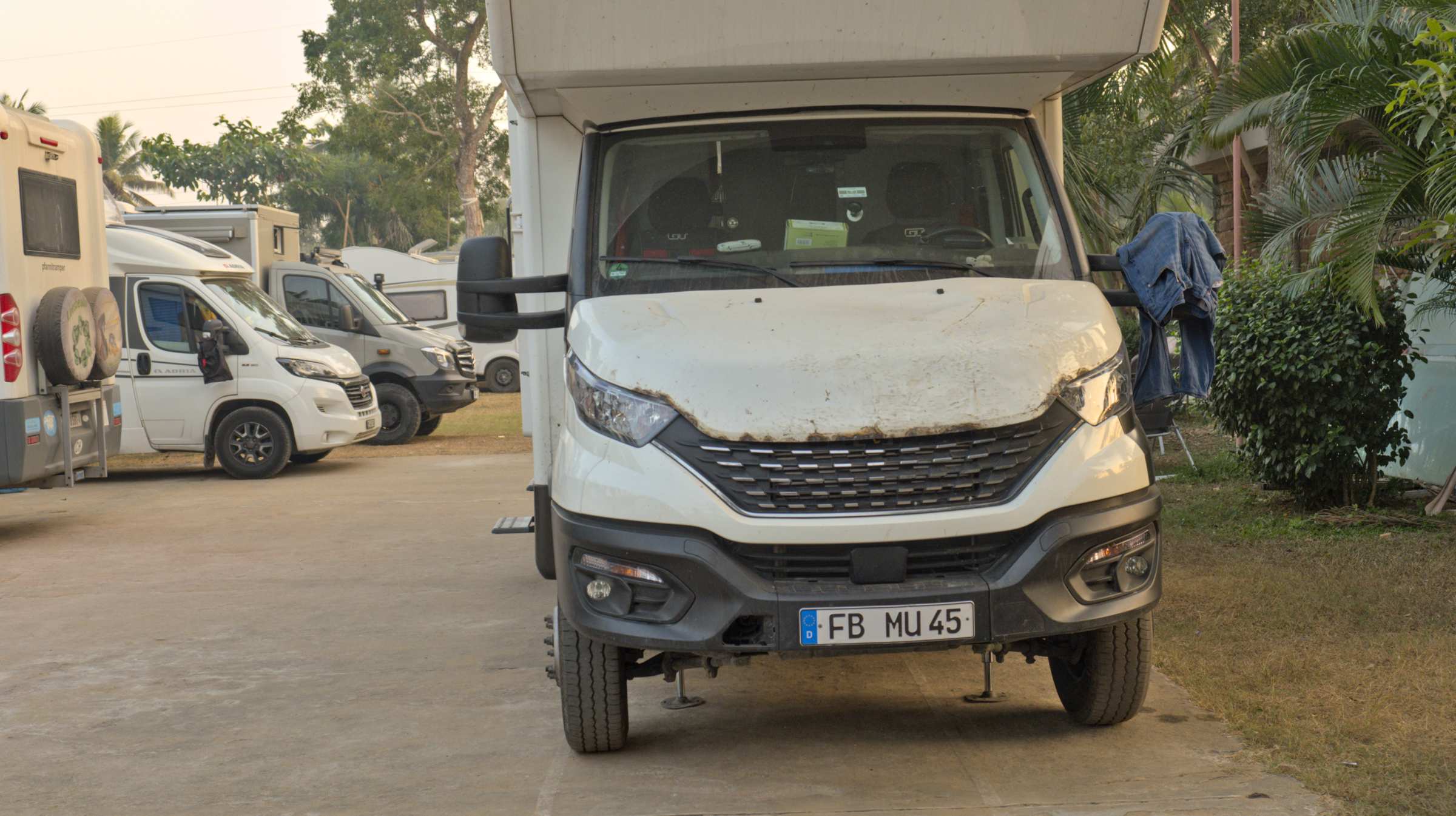 Während der Reise gab es schon einige Schäden. Eine Kupplung musste erneuert und auch aus Deutschland eingeflogen werden. Weitere Schäden: Abgerissenes Dachfenster und Klimaanlage, abgefahrener Ersatzreifen unterm Fahrzeug, verschobener Aufbau eines Pickups und und und. Indientypisch diverse "Feindberührungen", manche hatten die mehrmals, von TukTuks bis hin zu Bussen. Einige Fahrzeuge sehen schon ganz schön ramponiert aus. Reifenschäden gab es en masse, wobei sich die Goodrich All-Terrain-Reifen bisher sehr gut schlagen. Wir hatten bisher viel Glück. Toi toi toi!