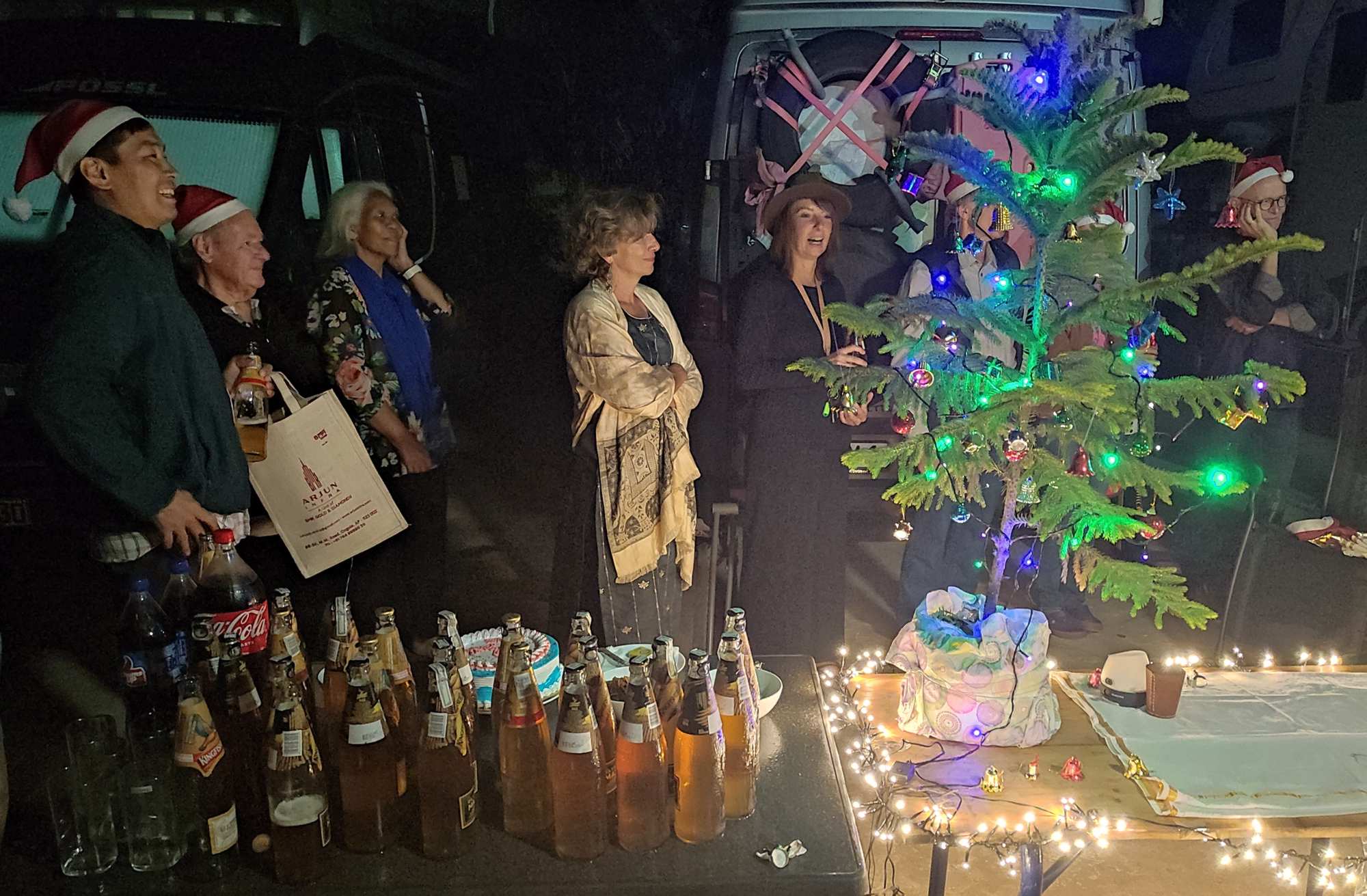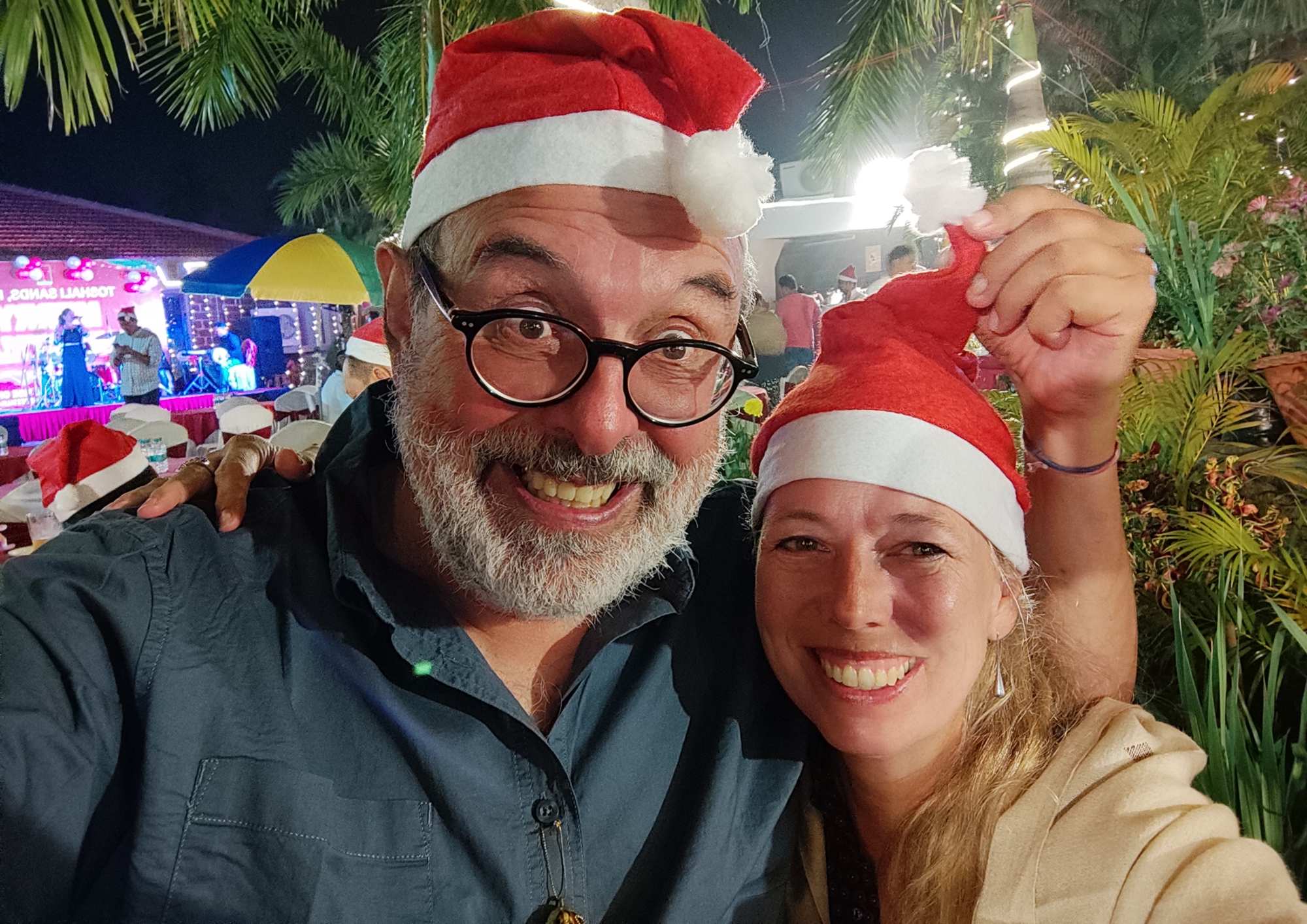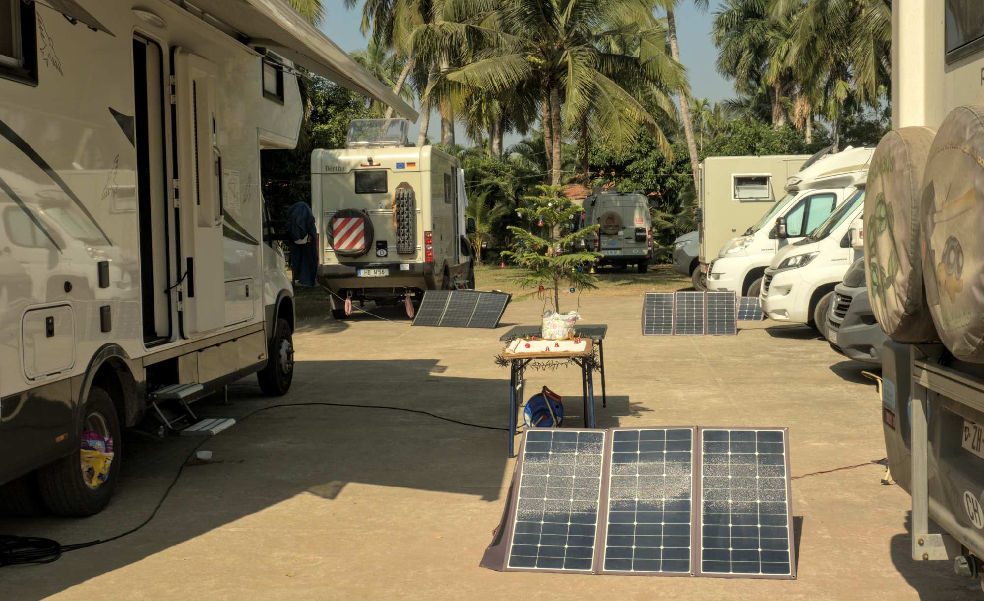 Weihnachten in Puri in einer Hotelanlage. Erst ziemlich indisch schrill und laut beim gemeinsamen Abendessen mit Band, dann eher besinnlich bei den Fahrzeugen unter uns.