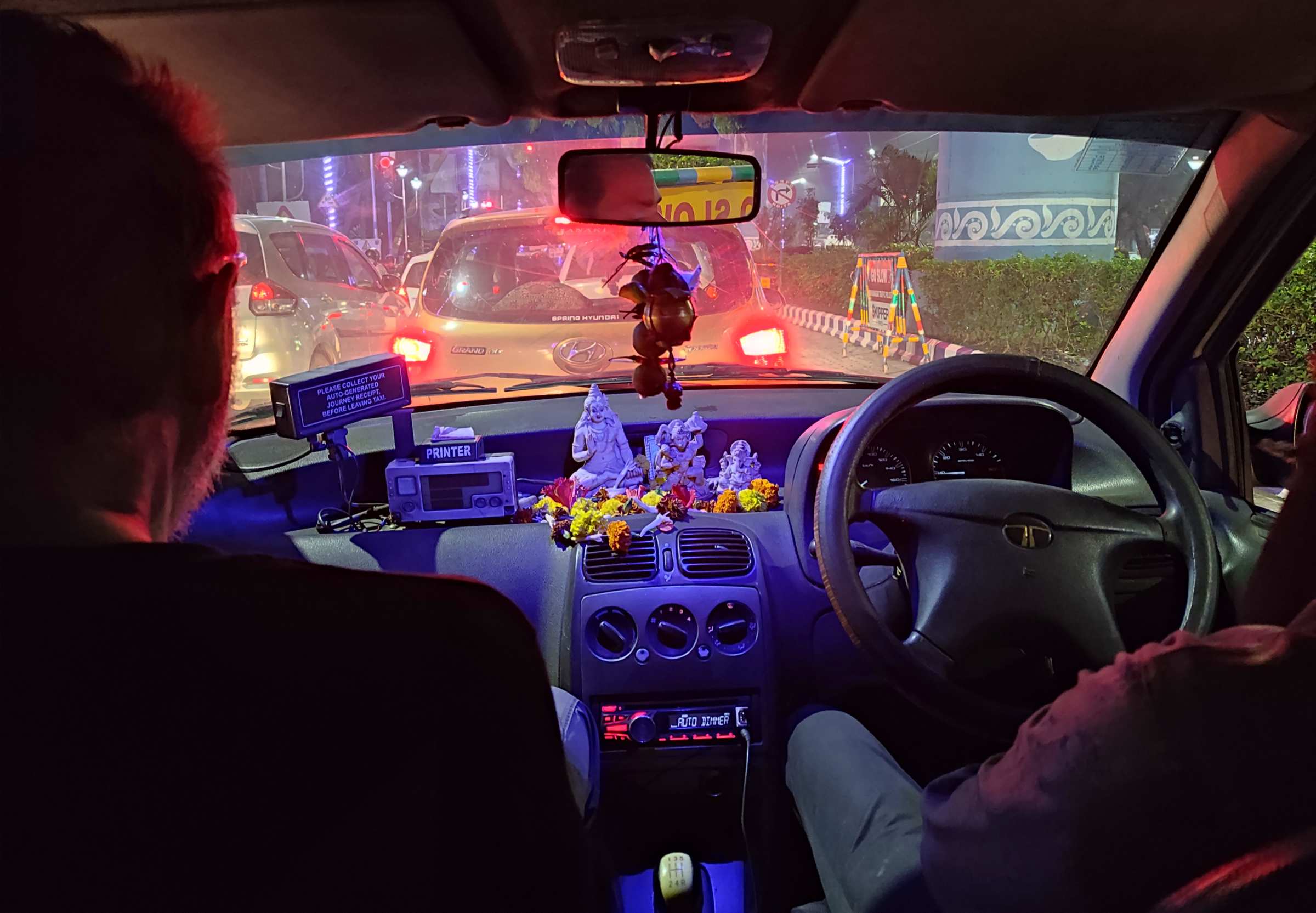 Der Taxifahrer, der uns wieder zu Bertha zurückbringt, hat einen kleinen Altar auf dem Armaturenbrett: Krishna, Hanuman und Ganesha (von links nach rechts).
