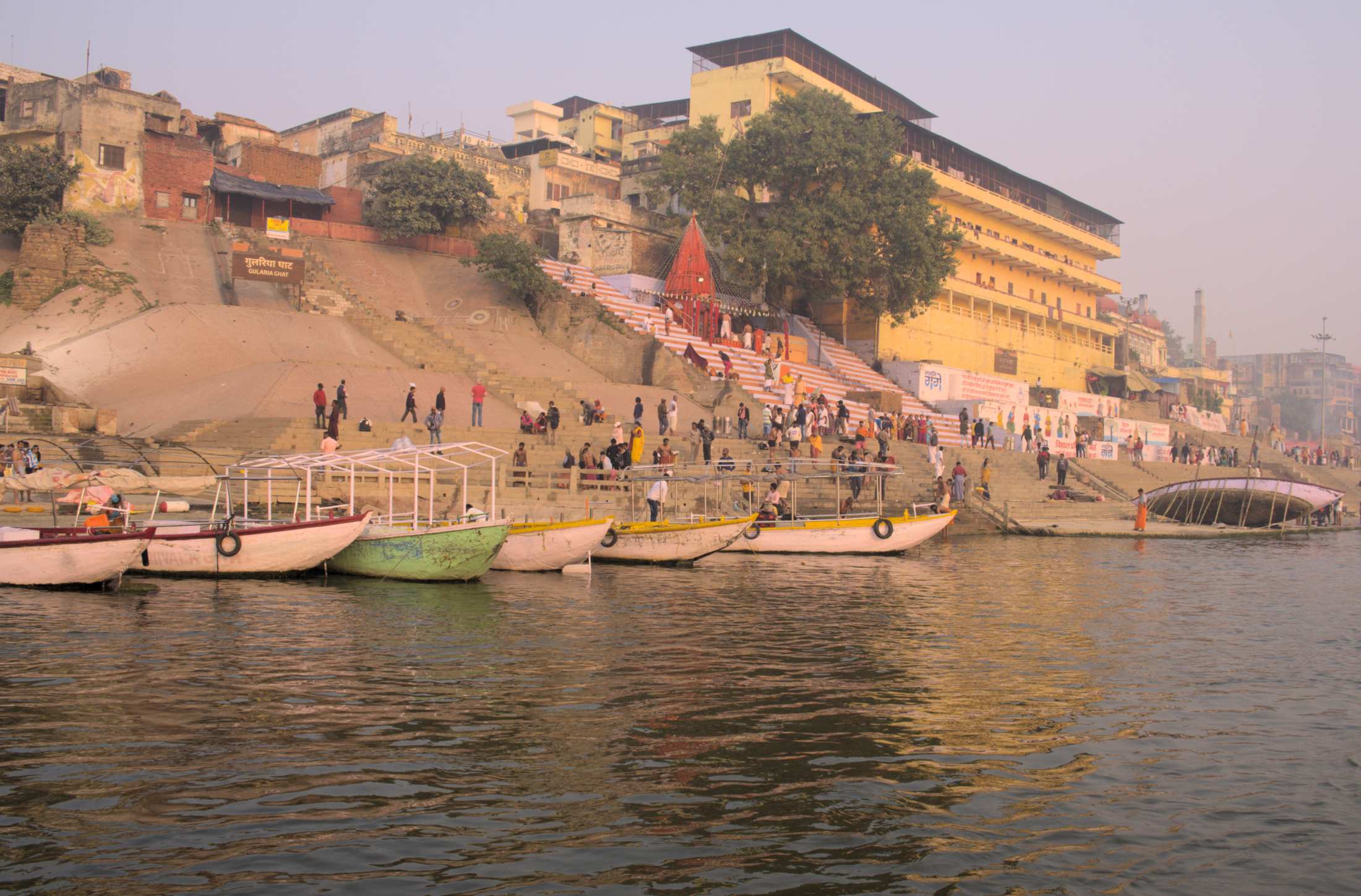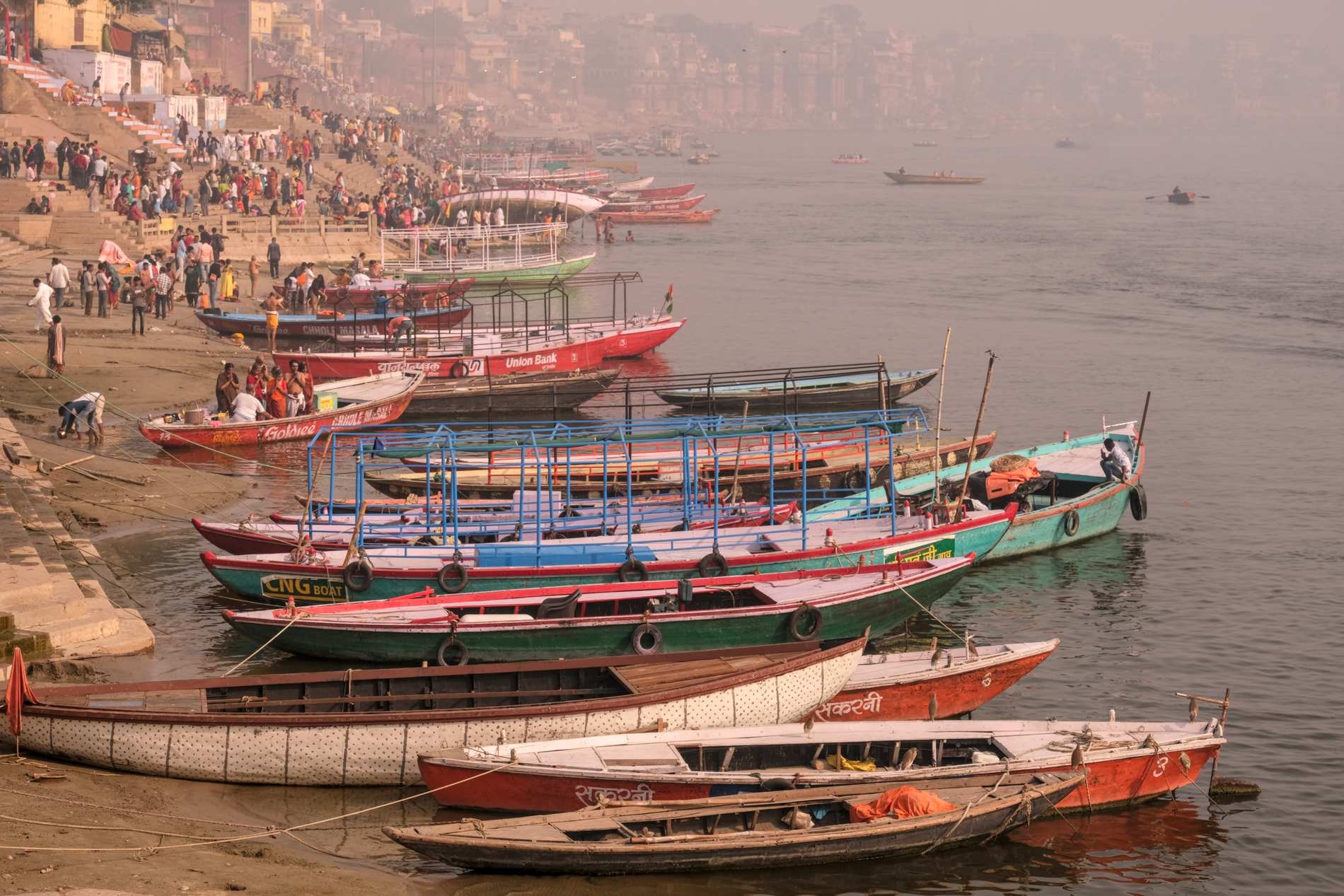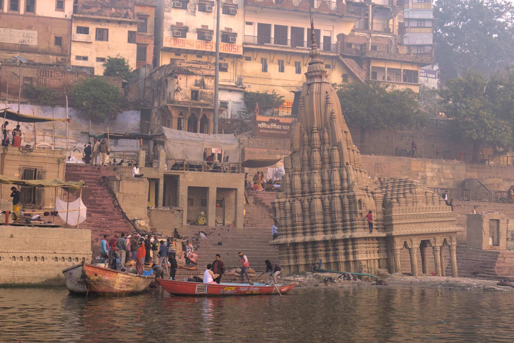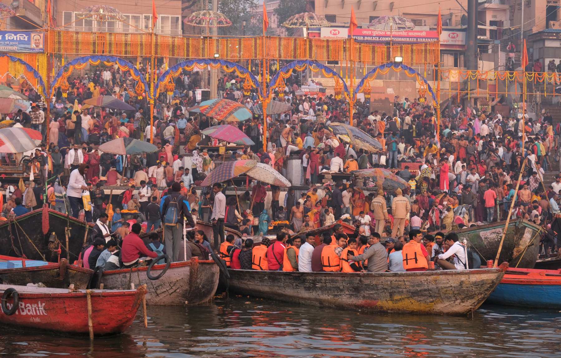 Viele Gläubige und Zuschauer kommen mit dem Boot und es herrscht indientypisch heilloses Durcheinander aber auch unendliche Gelassenheit.