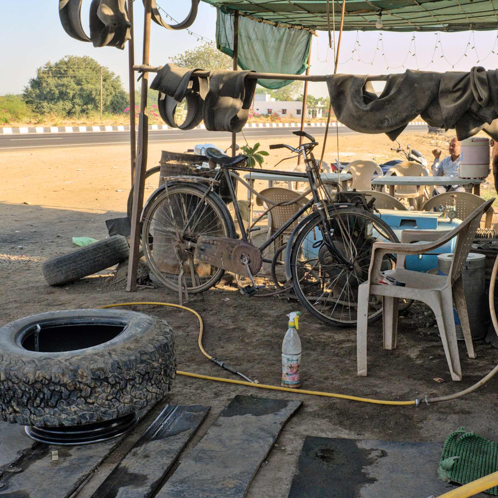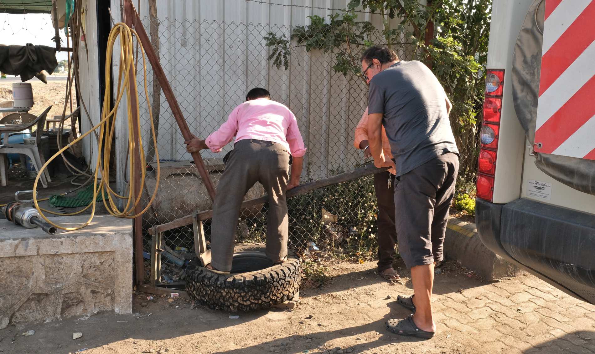 Zumindest für uns ungewöhnlicher Tankstellengast. Gleich nebenan lassen wir unseren Problemreifen reparieren. Diesmal wird er von der Felge genommen und innen mit einem Flicken dichtgeklebt.