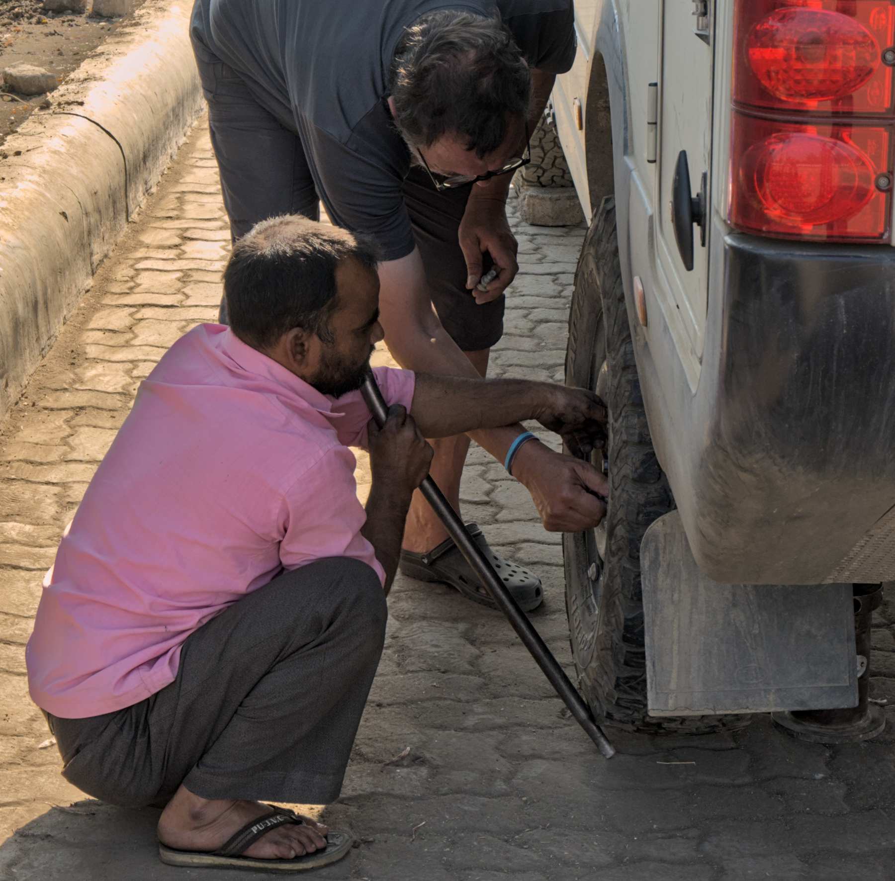 Unser vor fast drei Monaten geflickter Reifen verlor leider wieder Luft, so dass wir ihn heute morgen noch einmal demontieren ließen. Der Spezialist, Einzelkämpfer in einer Blechbude neben einer Tankstelle, hat ihn dann von der Felge genommen, den Reperaturpropfen, an dem die Luft herauskam, innen glattgehobelt, mit einem Flicken verschlossen, wieder auf die Felge gezogen und dann mit 70 PSI aufgepumpt. Scheint zu halten.
