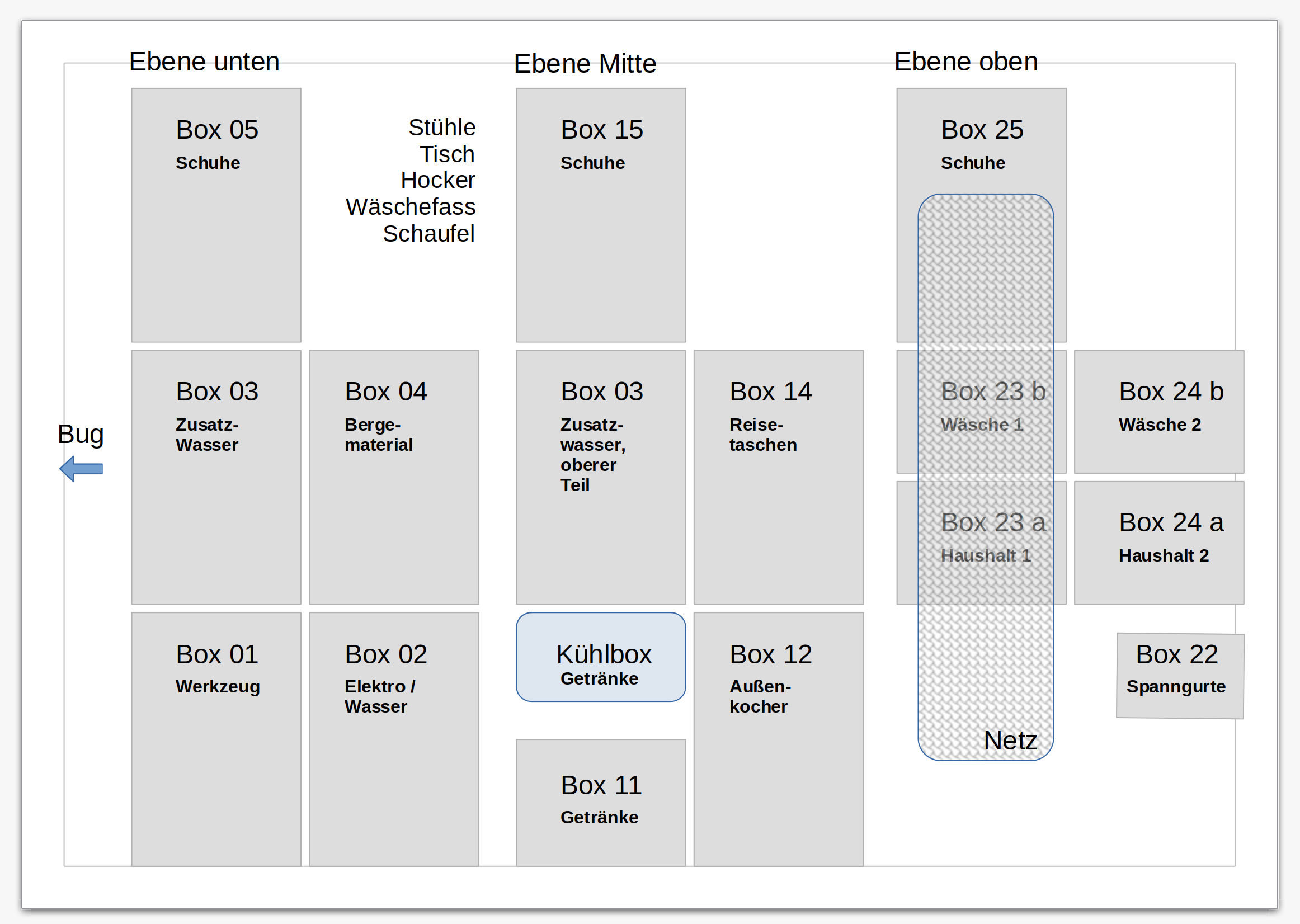 Es ist vorteilhaft, dem australischen Zoll Listen vorlegen zu können, was wo gelagert ist. Normalerweise kommen dort keine "beladenen" Fahrzeuge an. Unsere schon vorhandene Liste für den Heckraum passen wir auch noch einmal an.