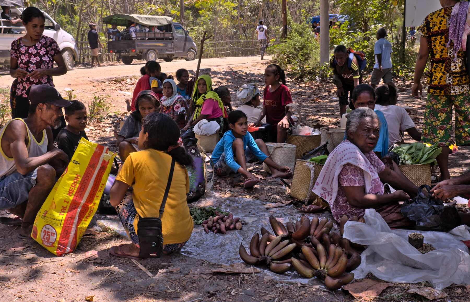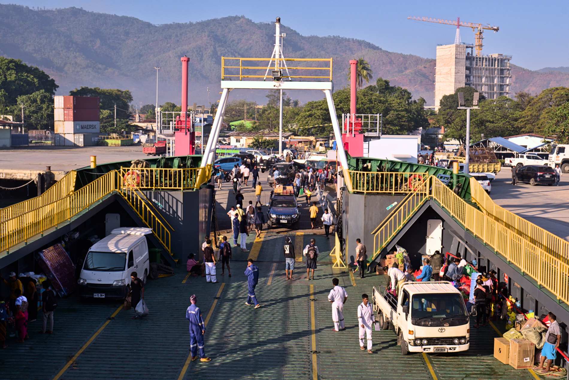Die Fahrzeuge stehen im Hafen von Dili und warten auf die Verschiffung.