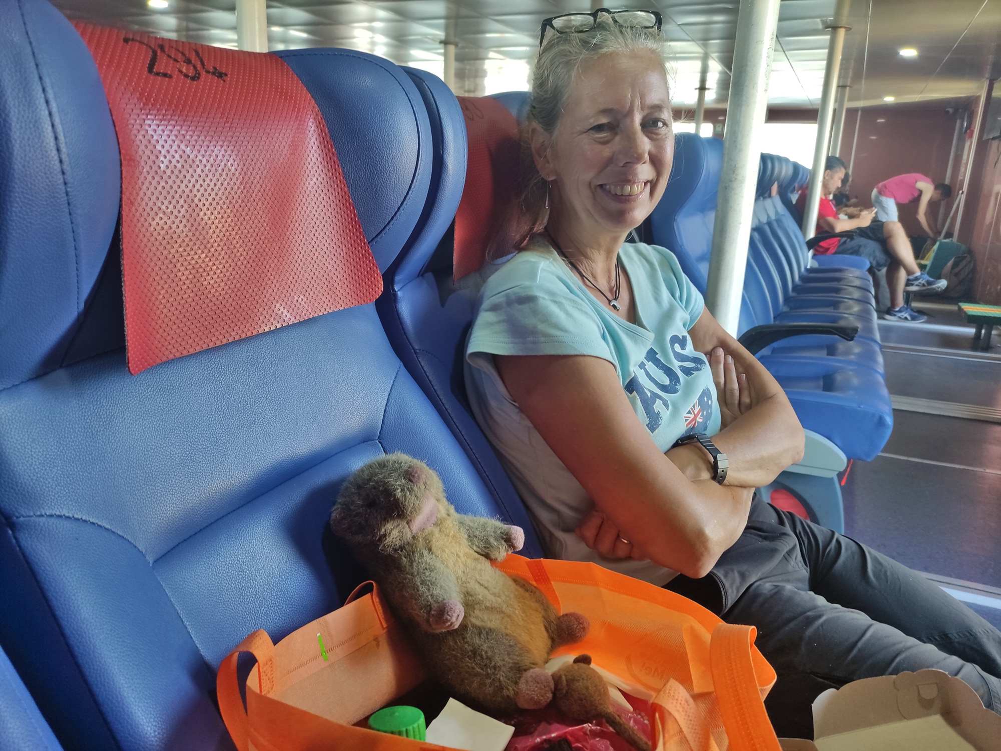 Ulrike fährt noch einmal mit dem Boot zurück auf die Insel, um unsere restlichen Sachen zu holen. Murmel ist schon reisefertig. Zurück nehmen sie den Flieger.