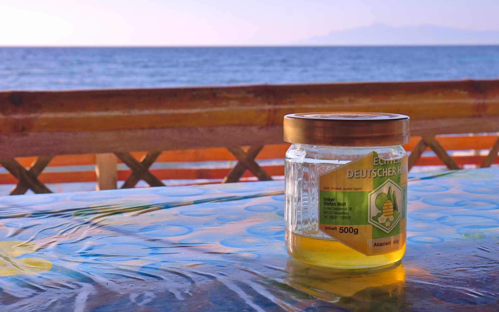 Das letzte Glas Honig von unserem Hausimker hat es um die halbe Welt bis hierher geschafft. Nun "müssen" wir es leeren, denn nach Australien darf es leider nicht mit.