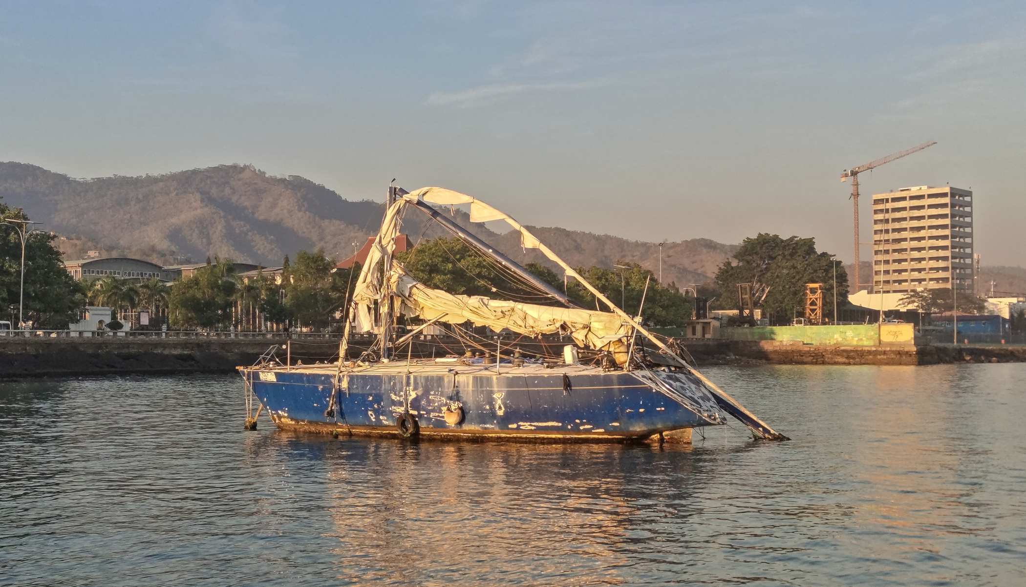 Vom Agenten in Dili bekommen wir dieses Video geschickt, das uns zeigt, wie gut die glänzende Bertha auf dem nigelnagelneuen Flatrack verzurrt ist. Das passt zusammen.