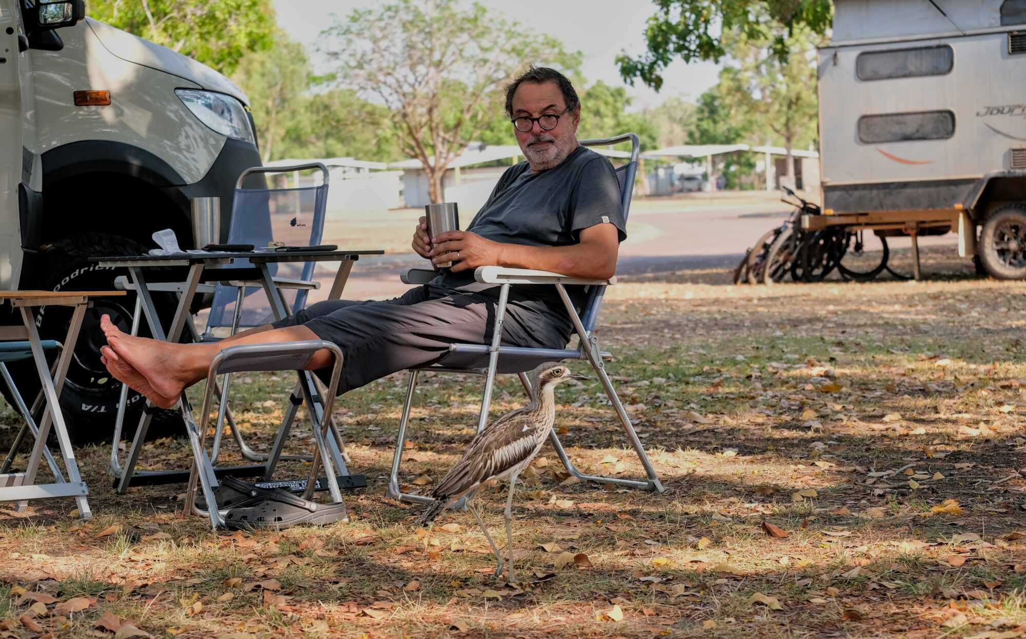Er besucht uns auf dem Campingplatz des Burk Hut Roadhouses. Diese "Rasthäuser" sind typisch für Australien, liegen an der Straße im Nirgendwo und bestehen meist aus Tankstelle, Laden, Kneipe und Platz für Camper.