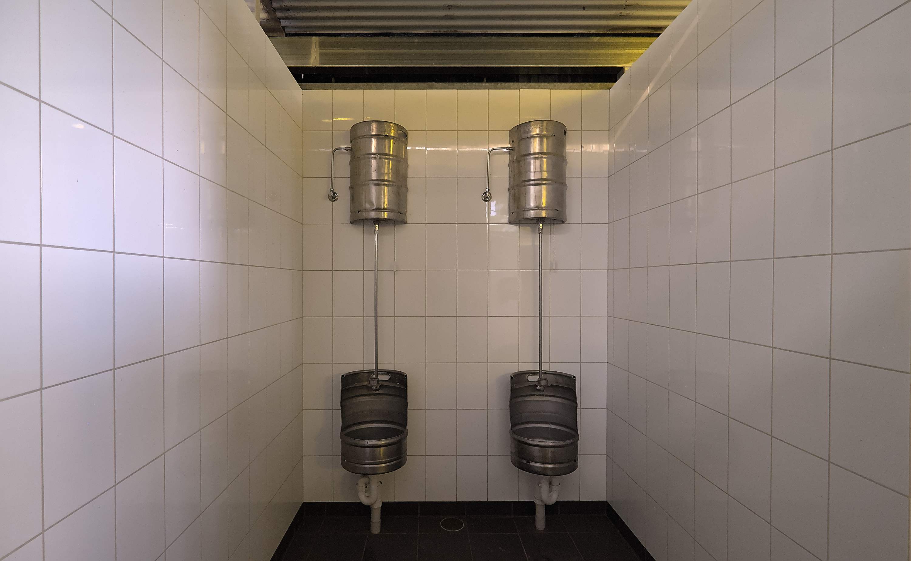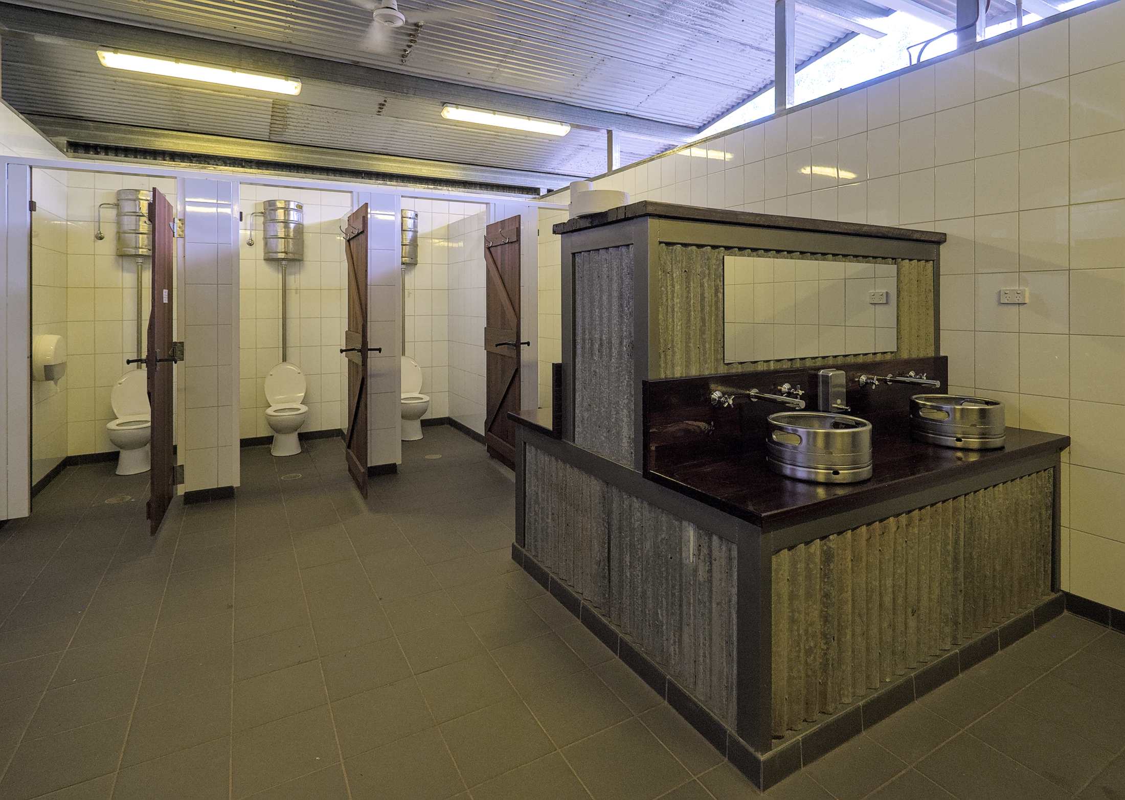 Der Sanitärtrakt sieht von außen nicht sehr vertrauenserweckend aus, innen geht es wider Erwarten edel zu. Die Ex-Bierfässer sind echt ein Hingucker.