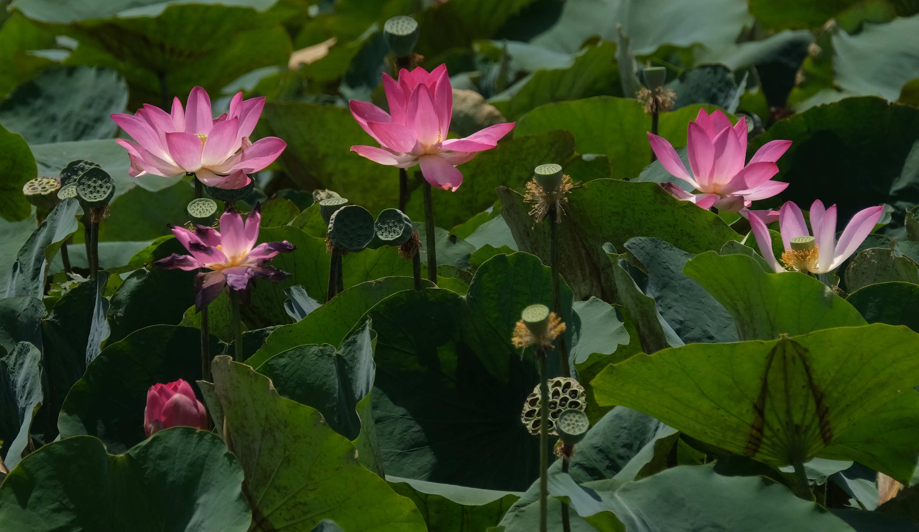 Lotusblüten und der passende Vogel dazu: Ein Lotusvogel.