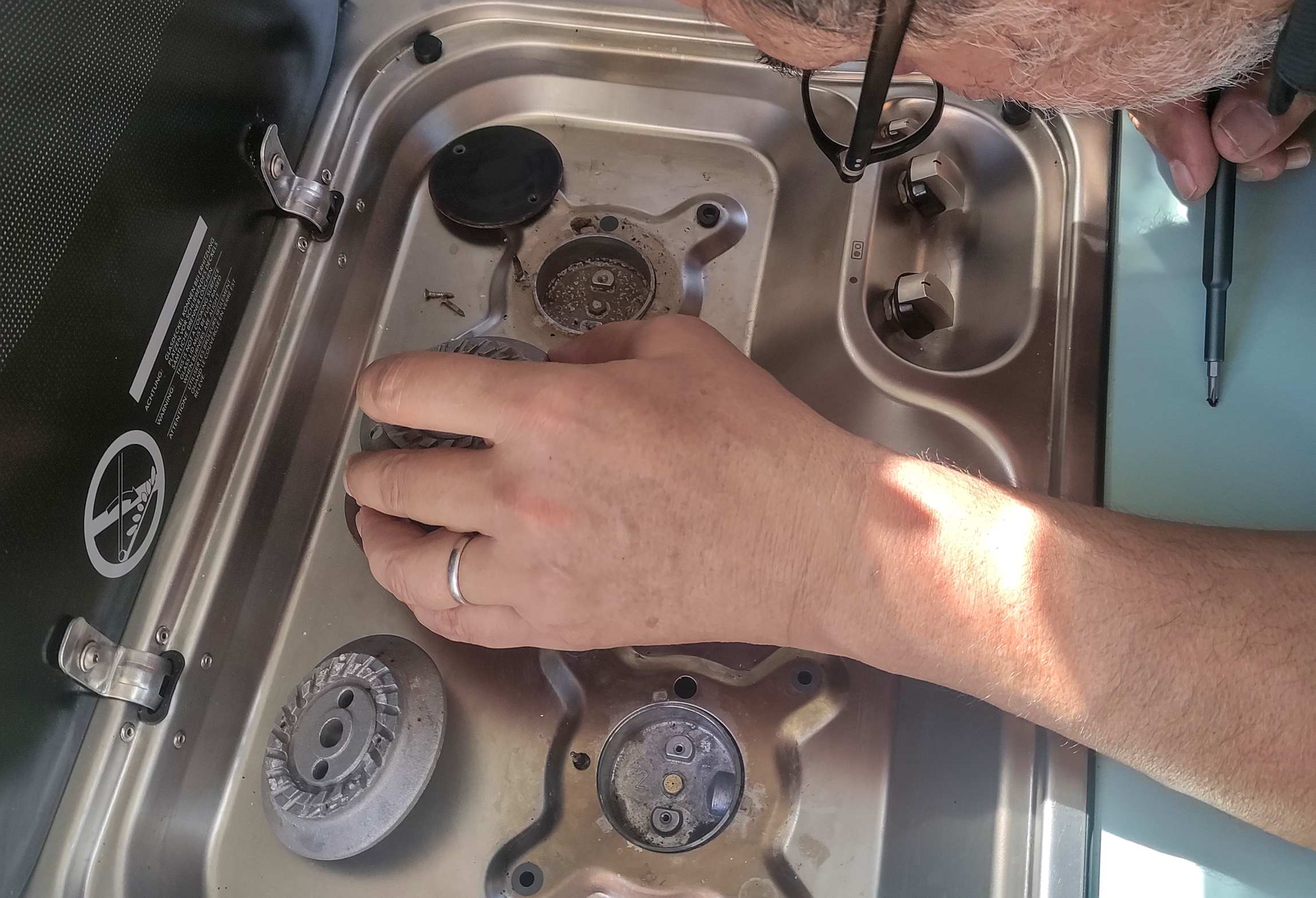 Wir reparieren den Gasherd mit Erfolg, die große Flamme brennt jetzt wieder.