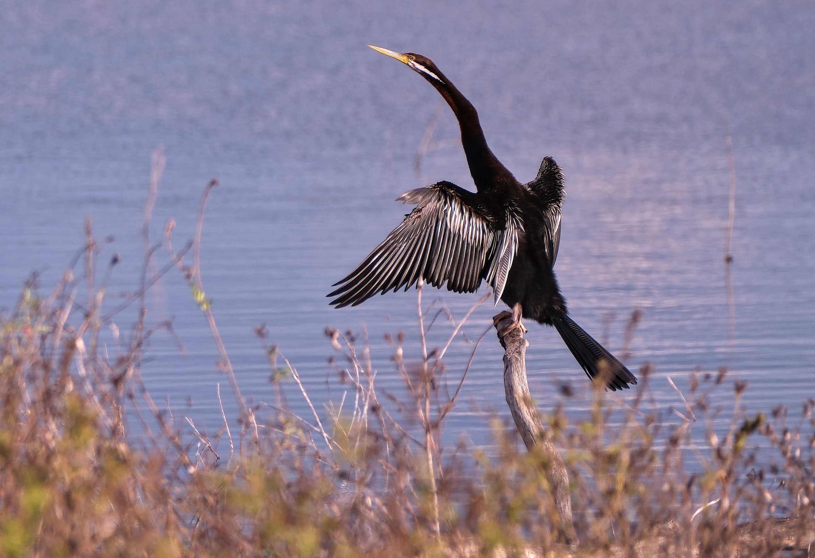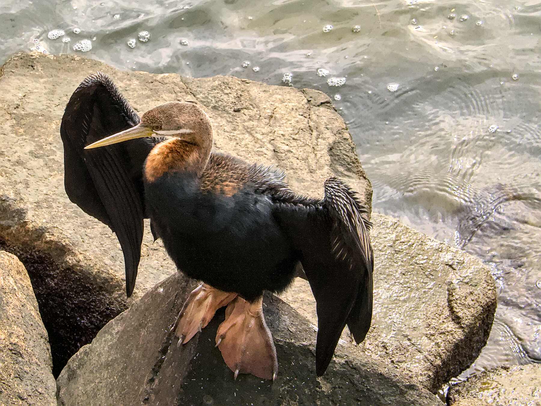 Ein australischer Schlangenhalsvogel, Verwandter des Kormorans, beim Trocknen mit schön großen und praktischen Füßen.