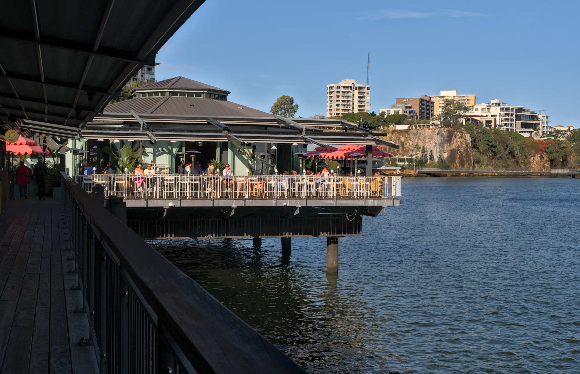 Unter der 'Story Bridge' genießen wir zwei Drinks, nobel und teuer, aber mit schöner Aussicht.
